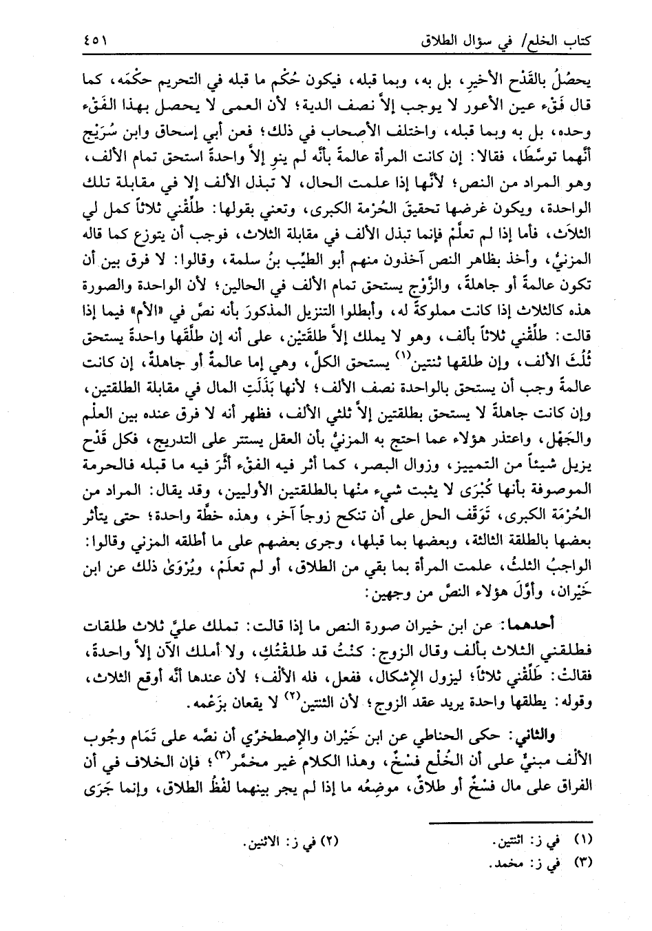 أحدهما: عن ابن خيران صورة النص ما إذا قالت: تملك عليَّ ثلاث طلقات فطلقني الثلاث بألف وقال الزوج: كنْتُ قد طلقْتُكِ، ولا أملك الآن إلاَّ واحدةً، فقالتْ: طَلِّقْني ثلاثا؛ ليزول الإِشكال، ففعل، فله الألْف؛ لأن عندها أنَّه أوقع الثلاث، وقوله: يطلقها واحدة يريد عقد الزوج؛ لأن الثنتين (¬2) لا يقعان بزَعْمه.