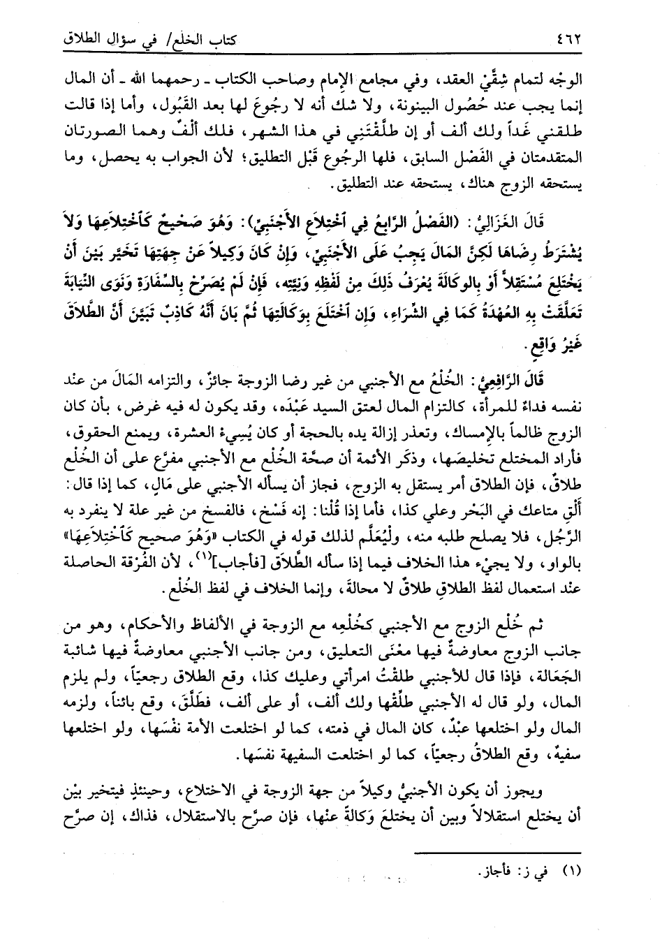قَالَ الغَزَالِيُّ: (الفَصْلُ الرَّابعُ فِي اخْتِلاعَ الأجْنَبِيِّ): وَهُوَ صَحْيحٌ كَاخْتِلاَعِهَا وَلاَ يُشْتَرَطُ رِضَاهَا لَكِنَّ المَالَ يَجِبُ عَلَى الأَجْنَبِيِّ، وَإِنْ كَانَ وَكِيلاً عَنْ جِهَتِهَا تَخَيَّر بَيْنَ أَنْ يَخْتَلِعَ مُسْتَقِلاَّ أَوْ بِالوكَالَةَ يُعْرَفُ ذَلِكَ مِنْ لَفْظِهِ وَنِيَّتِه، فَإِنْ لَمْ يُصَرِّحْ بِالسِّفَارَةِ وَنَوَى النِّيَابَةَ تَعَلَّقَتْ بِهِ العُهْدَةُ كَمَا فِي الشِّرَاءِ، وَإِن اخْتَلَعَ بِوَكَالَتِهَا ثُمَّ بَانَ أنَّهُ كَاذِبٌ تَبَيَّنَ أَن الطَّلاَقَ غَيْرُ وَاقِعٍ.