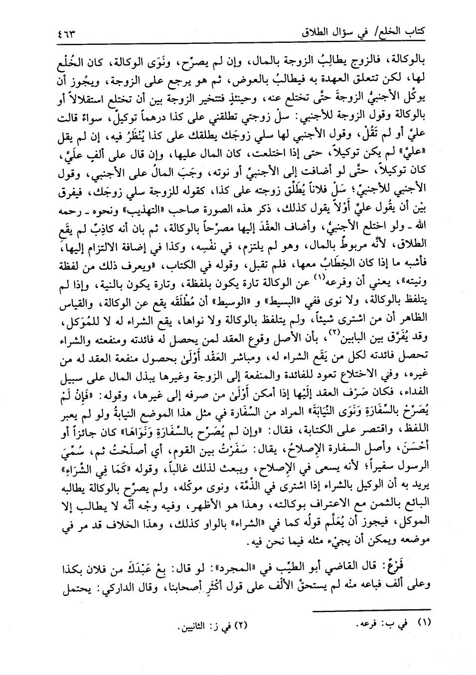 بالوكالة، فالزوج يطالِبُ الزوجة بالمال، وإن لم يصرِّح، ونَوَى الوكالة، كان الخُلْع لها، لكن تتعلق العهدة به فيطالبُ بالعوض، ثم هو يرجع على الزوجة، ويجُوز أن يوكِّل الأجنبيُّ الزوجةَ حتَّى تختلع عنه، وحينئدٍ فتتخير الزوجة بين أن تختلع استقلالاً أو بالوكالة وقول الزوجة للأجنبي: سلْ زوجتي تطلقني على كذا درهماً توكيلٌ، سواءٌ قالت عليَّ أو لم تَقُلْ، وقول الأجنبي لها سلي زوجَك يطلقك على كذا يُنْظَرُ فيه، إن لم يقل "عليَّ" لم يكن توكيلاً، حتى إذا اختلعت، كان المال عليها، وإن قال على ألفٍ علَيَّ، كان توكيلاً، حتَّى لو أضافت إلى الأجنبيِّ أو نوته، وجَبَ المالُ على الأجنبي، وقول الأجنبي للأجنبيِّ؛ سَلْ فلاناً يُطَلِّق زوجته على كذا، كقوله للزوجة سلي زوجَك، فيفرق بيْن أن يقُول عليَّ أَوْلاً يقول كذلك، ذكر هذه الصورة صاحب "التهذيب" ونحوه -رحمه الله- ولو اختلع الأجنبيُّ، وأضاف العقْدَ إليها مصرِّحاً بالوكالة، ثم بان أنه كاذِبٌ لم يقَع الطلاق، لأنَّه مربوطٌ بالمال، وهو لم يلتزم، في نفْسِه، وكذا في إضافة الالتزام إليها، فأشبه ما إذا كان الخِطَابُ معها، فلم تقبل، وقوله في الكتاب، "ويعرف ذلك من لفظة ونيته"، يعني أن وفرعه (¬1) عن الوكالة تارة يكون بلفظة، وتارة يكون بالنية، وإذا لم يتلفظ بالوكالة، ولا نوى ففي "البسيط" و"الوسيط" أن مُطْلَقَه يقع عن الوكالة، والقياس الظاهر أن من اشترى شيئاً، ولم يتلفظ بالوكالة ولا نواها، يقع الشراء له لا للمُوَكل، وقد يُفَرَّق بين البابين (¬2)، بأن الأصل وقوع العقد لمن يحصل له فائدته ومنفعته والشراء تحصل فائدته لكل من يَقَع الشراء له، ومباشر العَقْد أَوْلَى بحصول منفعة العقد له من غيره، وفي الاختلاع تعود للفائدة والمنفعة إلى الزوجة وغيرها يبذل المال على سبيل الفداء، فكان صَرْف العقد إلَيْها إذا أمكن أَوْلَى من صرفه إلى غيرها، وقوله: "فَإنْ لَمْ يُصَرِّحْ بالسِّفَارَةِ وَنَوَى النِّيَابَةَ" المراد من السِّفَارة في مثل هذا الموضع النيابةُ ولو لم يعبر اللفظ، واقتصر على الكتابة، فقال: "وإن لم يُصَرِّح بالسِّفَارَةِ وَنَوَاهَا" كان جائزاً أو أحْسَنَ، وأصل السفارة الإِصلاحُ، يقال: سَفَرْتُ بين القوم، أي أصلَحْتُ ثم، سُمِّيَ الرسول سفيراً؛ لأنه يسعى في الإِصلاح، ويبعث لذلك غالباً، وقوله "كَمَا فِي الشِّرَاءِ" يريد به أن الوكيل بالشراء إذا اشترى في الذِّمَّة، ونوى موكّله، ولم يصرِّح بالوكالة يطالبه البائع بالثمن مع الاعتراف بوكالته، وهذا هو الأظهر، وفيه وجْه أنَّه لا يطالب إلا الموكل، فيجوز أن يُعَلَّم قولُه كما في "الشراء" بالواو كذلك، وهذا الخلاف قد مر في موضعه ويمكن أن يجيْء مثله فيما نحن فيه.
