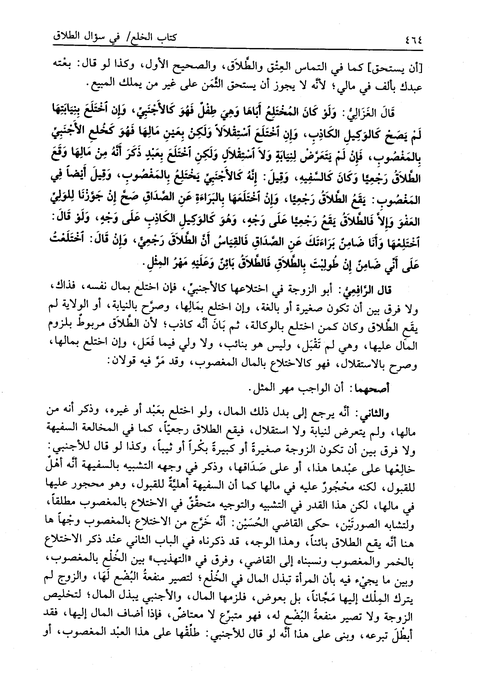 والثاني: أنَّه يرجع إلى بدل ذلك المال، ولو اختلع بعَبْد أو غيره، وذكر أنه من مالها، ولم يتعرض لنيابة ولا استقلال، فيقع الطلاق رجعيّاً، كما في المخالعة السفيهة ولا فرق بين أن تكون الزوجة صغيرةً أو كبيرةً بكْراً أو ثيباً، وكذا لو قال للأجنبي: خالِعْها على عبْدها هذا، أو على صَدَاقها، وذكر في وجهه التشبيه بالسفيهة أنَّه أهْلٌ للقبول، لكنه محْجُورٌ عليه في مالها كما أن السفيهة أهليَّةٌ للقبول، وهو محجور عليها في مالها لكن هذا القدر في التشبيه والتوجيه متحقِّقٌ في الاختلاع بالمغصوب مطلقاً، ولتشابه الصورتَيْن، حكى القاضي الحُسَيْن: أنَّه خَرَّج من الاختلاع بالمغصوب وجْهاً هاهنا أنَّه يقع الطلاق بائناً، وهذا الوجه، قد ذكرناه في الباب الثاني عنْد ذكر الاختلاع بالخمر والمغصوب ونسبناه إلى القاضي، وفرق في "التهذيب" بين الخُلْع بالمغصوب، وبين ما يجيْء فيه بأن المرأة تبذل المال في الخُلْع؛ لتصير منفعةُ البُضْع لَهَا، والزوج لم يترك المِلْك إليها مَجَّاناً، بل بعوض، فلزمها المال، والأجنبي يبذل المال؛ لتخليص الزوجة ولا تصير منفعةُ البُضْع له، فهو متبرِّع لا معتاضٌ، فإذا أضاف المال إليها، فقد أبطْلَ تبرعه، وبنى على هذا أنَّه لو قال للأجنبي: طلِّقْها على هذا العبْد المغصوب، أو