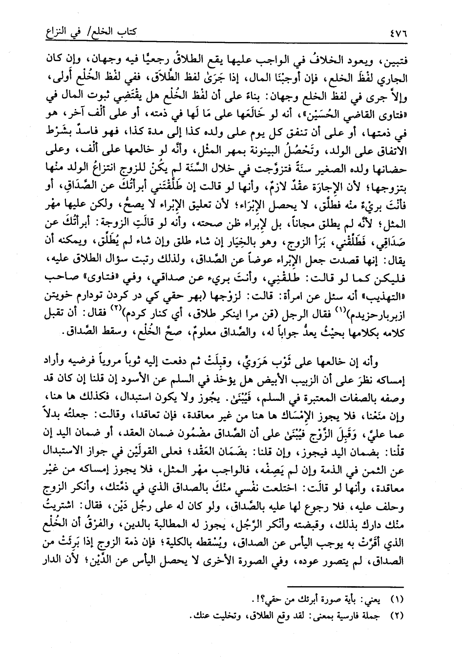 فتبين، ويعود الخلافُ في الواجب عليها يقع الطلاقُ رجعيًّا فيه وجهان، وإن كان الجاري لفْظَ الخلع، فإن أوجبْنَا المال، إذا جَرَى لفظ الطَّلاَق، ففي لفْظ الخُلْع أَولى، وإلاَّ جرى في لفظ الخلع وجهان: بناءً على أن لفْظ الخُلْع هل يقْتَضِي ثبوت المال في "فتاوى القاضي الحُسَيْن"، أنه لو خَالَعَها على مَا لَها في ذمته، أو على ألْف آخر، هو في ذمتها، أو على أن تنفق كل يوم على ولده كذا إلى مدة كذا، فهو فاسدٌ بشَرْط الاتفاق على الولد، وتَحْصُلُ البينونة بمهر المثْل، وأنَّه لو خالعها على ألْف، وعلى حضانها ولده الصغير سنَةً فتزوَّجت في خلال السَّنَة لم يكُنْ للزوج انتزاعُ الولد منْها بتزوجها، لأن الإِجارَة عقْدٌ لازمٌ، وأنها لو قالت إن طَلَّقْتَني أبرأتُكَ عن الصَّدَاقِ، أو فأنْتَ بريْءً منْه فطَلَّق، لا يحصل الإِبْرَاء؛ لأن تعليق الإبْراء لا يصحُّ، ولكن عليها مهْر المثل؛ لأنَّه لم يطلق مجاناً، بل لإِبراء ظن صحته، وأنه لو قالَتِ الزوجة: أبرأتُكَ عن صَدَاقِي، فَطَلِّقْني، بَرَأ الزوج، وهو بالخِيَار إن شاء طلق وإن شاء لم يُطَلِّق، ويمكنه أن يقال: إنها قصدت جعل الإِبْراء عوضاً عن الصَّداق، ولذلك رتبت سؤال الطلاق عليه، فليكن كما لو قالت: طَلقْنِي، وأنتَ بريء عن صداقي، وفي "فتاوى" صاحب "التهذيب" أنه سئل عن امرأة: قالت: لزوْجها (بهر حقي كي در كردن تودارم خويتن ازبربارحزيدم) (¬1) فقال الرجل (قن مرا اينكر طلاق، أي كنار كردم) (¬2) فقال: أن تقبل كلامه بكلامها بحيْثُ يعدُّ جواباً له، والصَّداق معلومٌ، صحَّ الخُلْع، وسقط الصَّداق.