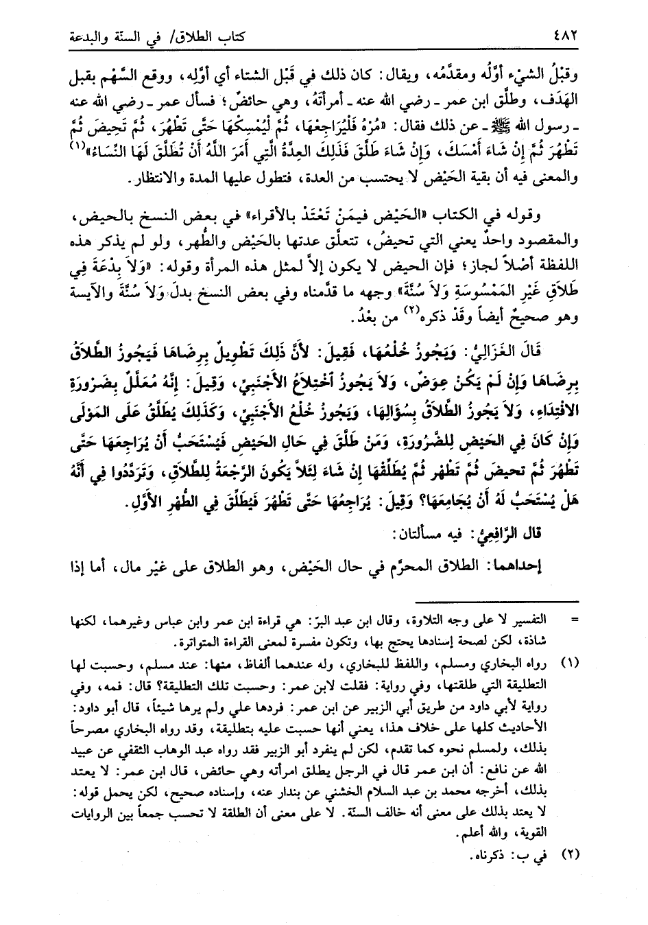 (¬1) رواه البخاري ومسلم، واللفظ للبخاري، وله عندهما ألفاظ، منها: عند مسلم، وحسبت لها التطليقة التي طلقتها، وفي رواية: فقلت لابن عمر: وحسبت تلك التطليقة؟ قال: فمه، وفي رواية لأبي داود من طريق أبي الزبير عن ابن عمر: فردها علي ولم يرها سيئاً، قال أبو داود: الأحاديث كلها على خلاف هذا، يعني أنها حسبت عليه بتطليقة، وقد رواه البخاري مصرحاً بذلك، ولمسلم نحوه كما تقدم، لكن لم ينفرد أبو الزبير فقد رواه عبد الوهاب الثقفي عن عبيد الله عن نافع: أن ابن عمر قال في الرجل يطلق امرأته وهي حائض، قال ابن عمر: لا يعتد بذلك، أخرجه محمد بن عبد السلام الخشني عن بندار عنه، وإسناده صحيح، لكن يحمل قوله: لا يعتد بذلك على معنى أنه خالف السنّة. لا على معنى أن الطلقة لا تحسب جمعاً بين الروايات القوية، والله أعلم.