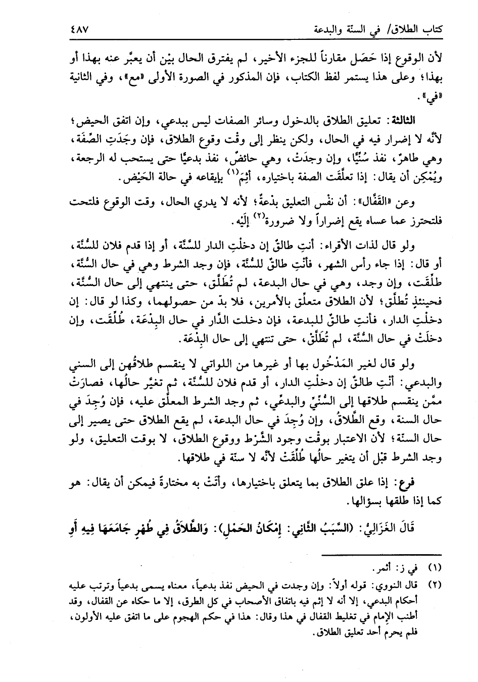 (¬2) قال النووي: قوله أولاً: وإن وجدت في الحيض نفذ بدعياً، معناه يسمى بدعياً وترتب عليه أحكام البدعي، إلا أنه لا إثم فيه باتفاق الأصحاب في كل الطرق، إلا ما حكاه عن القفال، وقد أطنب الإِمام في تغليط القفال في هذا وقال: هذا في حكم الهجوم على ما اتفق عليه الأولون، فلم يحرم أحد تعليق الطلاق.