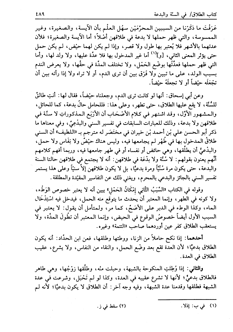 وعن أبي إسحاق: أنها لو كانت ترى الدم، وجعلناه حيْضاً، فقال لها: أنتِ طالقٌ للسُّنَّة، لا يقع عليها الطلاق، حتى تطهر، وعلى هذا: فللحامل حالُ بدعة، كما للحائل، والمشهور الأوَّل، وقد اشتهر في كلام الأصْحَاب أن الأرْبَع المذكوراتِ لا سنَّة في طلاقهن ولا بدعة، وذلك للعبارات السابقات في تفسير السني والبدْعِيِّ، وفي معناها ما ذكر أبو الحسن علي بْن أحمد بْن خيران في مختَصَر له مترجم بـ"اللطيف" أن السني طلاقُ المدخول بها في طُهْر لم يجامعها فيه، وليس هناك حيْضٌ ولا نِفَاس ولا حمل، والبدْعيُّ أن يطلِّقها، وهي حائض أو نفساء أو في طهر جامعها فيه، وربما أفهم كلامهم أنَّهم يعنون بقولهم: لا سُنَّة ولا بدْعَة في طلاقهن: أنه لا يجتمع في طلاقهن حالتا السنة والبدعة، حتى يكون مرة سُنِّيَّاً ومرة بدعيًّا، بل لا يكون طلاقهن إلاَّسنيّاً وعلى هذا يستمر تفيسر السني بالجائز والبدعي بالمحرم، ويغني ذلك عن التفاسير المقيّدة والمطلقة.
