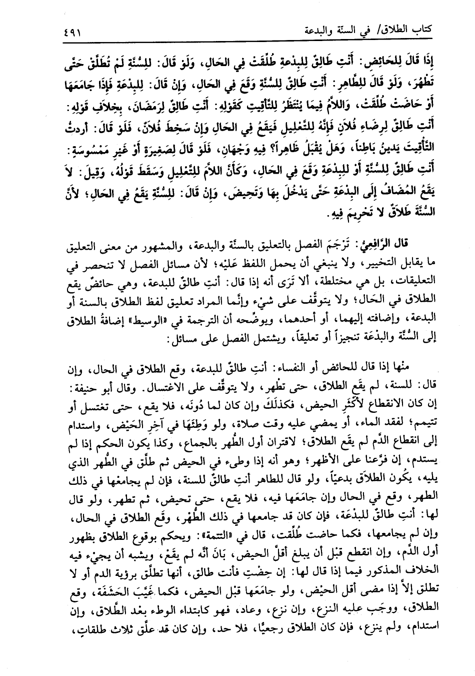 قال الرَّافِعِيُّ: تَرْجَمَ الفصل بالتعليق بالسنَّة والبدعة، والمشهور من معنى التعليق ما يقابل التخيير، ولا ينبغي أن يحملى اللفظ عَليْه؛ لأن مسائل الفصل لا تنحصر في التعليقات، بل هي مختلطة، ألا تَرَى أنه إذا قال: أنتِ طالقٌ للبدعة، وهي حائضٌ يقع الطلاق في الحَال؛ ولا يتوقَّف على شيْء وإنَّما المراد تعليق لفظ الطلاق بالسنة أو البدعة، واضافته إليهما، أو أحدهما، ويوضِّحه أن الترجمة في "الوسيط" إضافةُ الطلاق إلى السُّنَّة والبدْعَة تنجيزاً أو تعليقاً، ويشتمل الفصل على مسائل: