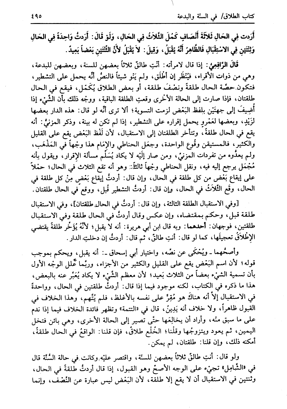 قَالَ الرَّافِعِيُّ: إذا قال لامرأته: أنْتِ طالقٌ ثلاثاً بعضهن للسنة، وبعضهن للبدعة، وهي من ذوات الأقراء، فيُنْظَر إن أطْلَق، ولم يَنْو شيئاً فالنصُّ أنَّه يحمل على التشطير، فتكون حصَّة الحال طلقةً ونصْفَ طلقة، أو بعض الطلاق يُكَمّل، فيقع في الحال طلقتان، فإذا صارت إلى الحالة الأخْرى وقعتِ الطلقة الباقية، ووجْه ذلك بأن الشَّيْء إذا أُضِيف إلى جهتَيْن بلفظ البَعْض لزمت التسوية؛ ألا ترى أنَّه لو قال: هذه الدار بعضها لزَيْدٍ، وبعضها لعَمْرو يحمل إقراره على التشطير، إذا لم تكن له بينة، وذكر المزنيُّ: أنه يقع في الحال طلقةً، وتتأخر الطلقتان إلى الاستقبال؛ لأن لَفْظ البَعْض يقع على القليل والكثير، فالمستيقن وقُوع الواحدة، وجعَل الحناطي والإِمَام هذا وجْهاً في المَذْهَب، ولم يعدُّوه من تفردات المزنيِّ، ومن صار إلَيْه لا يكاد يُسَلِّم مسألة الإِقرار، ويقول يأنه مُجْمَل يرجع إليه فيه، ونقل الحناطي وجهاً ثالثاً: وهو أنه تقع الثلاث في الحال؛ حمْلاً على إيقاع بَعْض من كل طلقة في الحال، وإن قال: أردتُّ إيقاع بَعْضٍ مِنْ كل طلقة في الحال، وقَع الثَّلاَثُ في الحال، وإن قال: أردتُّ التشطير قُبل، ووقع في الحال طلقتان.