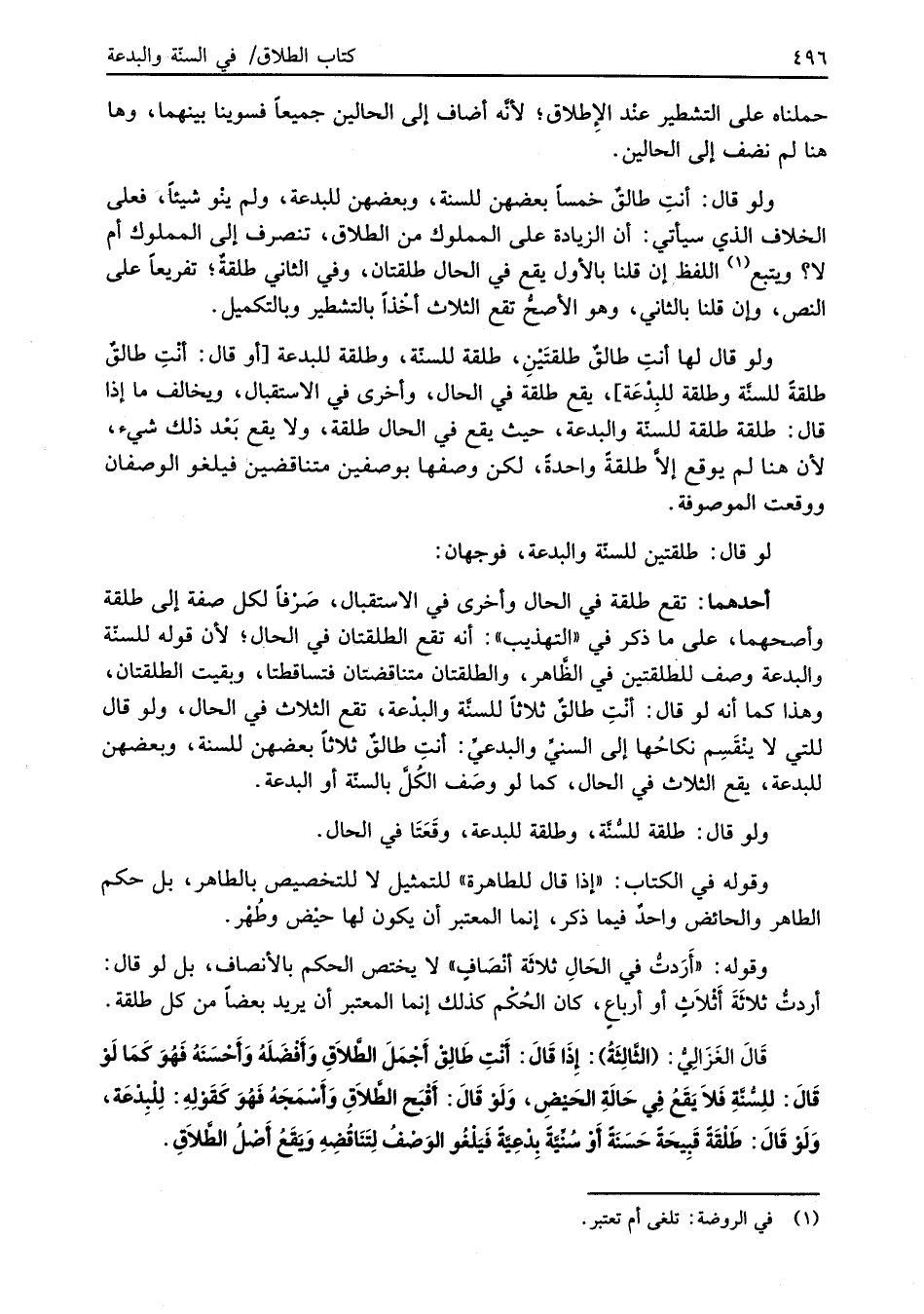 ولو قال لها أنتِ طالقٌ طلقتَيْنِ، طلقة للسنّة، وطلقة للبدعة [أو قال: أنْتِ طالقٌ طلقةً للسنَّة وطلقة للبدْعَة]، يقع طلقة في الحال، وأخرى في الاستقبال، ويخالف ما إذا قال: طلقة طلقة للسنّة والبدعة، حيث يقع في الحال طلقة، ولا يقع بَعْد ذلك شيء، لأن هنا لم يوقع إلاَّ طلقةً واحدةً، لكن وصفها بوصفين متناقضين فيلغو الوصفان ووقعت الموصوفة.