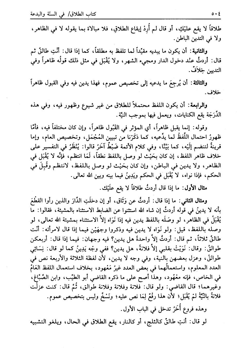 والثانية: أن يكون ما يبديه مقيِّداً لما تلفظ به مطلقاً، كما إذا قال: أنْتِ طالقٌ ثم قال: أردتُّ عند دخول الدار ومجيء الشهر، ولا يُقْبَل في مثل ذلك قولُه ظاهراً وفي التديين خِلاَفٌ.
