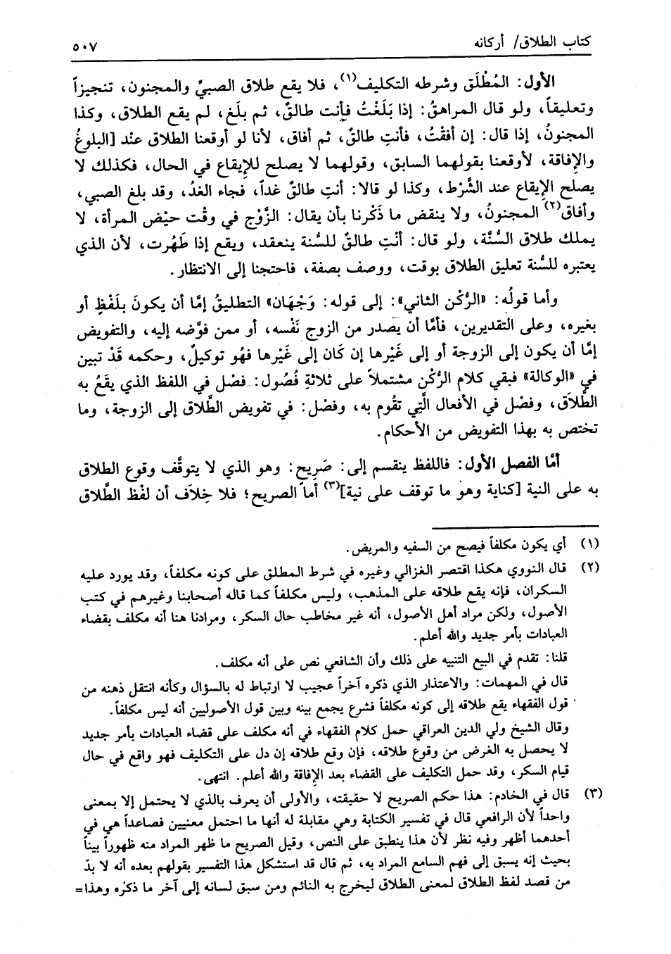 (¬2) قال النووي هكذا اقتصر الغزالي وغيره في شرط المطلق على كونه مكلفاً، وقد يورد عليه السكران، فإنه يقع طلاقه على المذهب، وليس مكلفاً كما قاله أصحابنا وغيرهم في كتب الأصول، ولكن مراد أهل الأصول، أنه غير مخاطب حال السكر، ومرادنا هنا أنه مكلف بقضاء العبادات بأمر جديد والله أعلم.