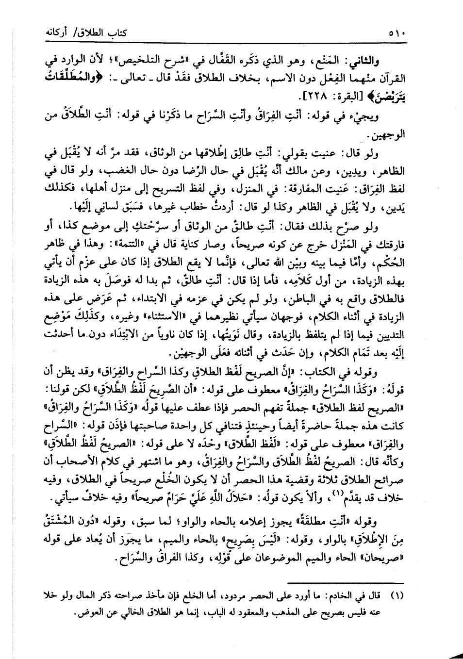 وقوله "أنْتِ مطلقَةٌ" يجوز إعلامه بالحاء والواو؛ لما سبق، وقوله "دُون المُشْتَقِّ مِنَ الإِطْلاَقِ" بالواو، وقوله: "لَيْسَ بِصَرِيحٍ" بالحاء والميم، ما يجوز أن يُعاد على قوله "صريحان" الحاء والميم الموضوعان على قوْلِه، وكذا الفراقُ والسَّرَاح.