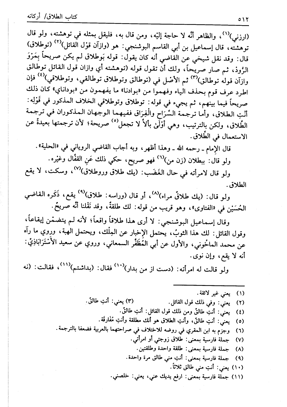 (ارزني) (¬1)، والظاهر أنَّه لا حاجة إليْه، ومن قال به، فليقل بمثله في توهشته، ولو قال توهشته، قال إسماعيل بن أبي القاسم البوشنجي: هو (وازآن قوْل القائل) (¬2) (توطلاق) قال: وقد نقل شيخي عن القاضي أنه كان يقول: قوله بَوطلاق لم يكن صريحاً بِمَرْوَ الرُّودْ، ثم صار صريحاً، ولك أن تقول قوله (توهشته أي وازان قول القائل توطالق وازآن قوله توطالق) (¬3) ثم الأصْل في (توطالق وتوطلاق توطالقي، وتوطلاقي) (¬4) فإن اطرد عرف قوم بحذف الياء وفهموا من "بوادنا" ما يفهمون من "بوداناي" كان ذلك صريحاً فيما بينهم، ثم يجيء في قوله: توطلاق وتوطلاقي الخلاف المذكور في قَوْلِه: أنْتِ الطلاق، وأما ترجمة السَّرَاح والْفِرَاق ففيهمما الوجهان المذكوران في ترجمة الطَّلاق، ولكن بالترتيب، وهي أوْلَى بالاَّ لا تجعل (¬5) صريحة؛ لأن ترجمتها بعيدةٌ عن الاستعمال في الطَّلاق.