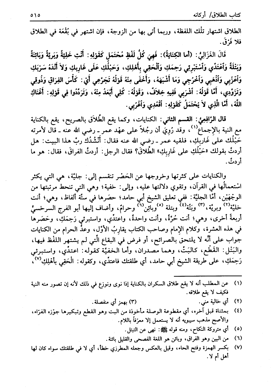قَالَ الغَزَالِيُّ: (أما الكِنَايَة): فَهِيَ كُلُّ لَفْظٍ مُحْتَمَل كَقَوْلِهِ: أَنْتِ خَلِيَّةٌ وَبَريَّةٌ وَبَائِنَةٌ وَبَتْلَةٌ وَاعْتَدِّي وَاسْتَبرِئِي رَحِمَكِ وَالْحَقِي بِأَهْلِكِ، وَحَبْلُكِ عَلَى غَارِبكِ وَلاَ أَنْدَهُ سَرْبَكِ وَاعْزُبِي وَاذْهَبِي وَاخْرُجِي وَمَا أَشْبَهَهُ، وَأَخْفَى مِنْهُ قَوْلُهُ تَجَرَّعِي أَيْ: كَأْسَ الفِرَاقِ وَذُوقِي وَتَزَوَّدِي، أَمَّا قَوْلُهُ: اشْرَبِي فَفِيهِ خِلاَفٌ، وَقَوْلُهُ: كُلِي أَبْعَدُ مِنْهُ، وَتَرَدَّدُوا في قَوْلِهِ: أَغْنَاكِ اللَّهُ، أَمَّا الَّذِي لاَ يُحْتَمَلُ كَقَوْلِهِ: اقْعُدِي وَاغْرُبِي.
