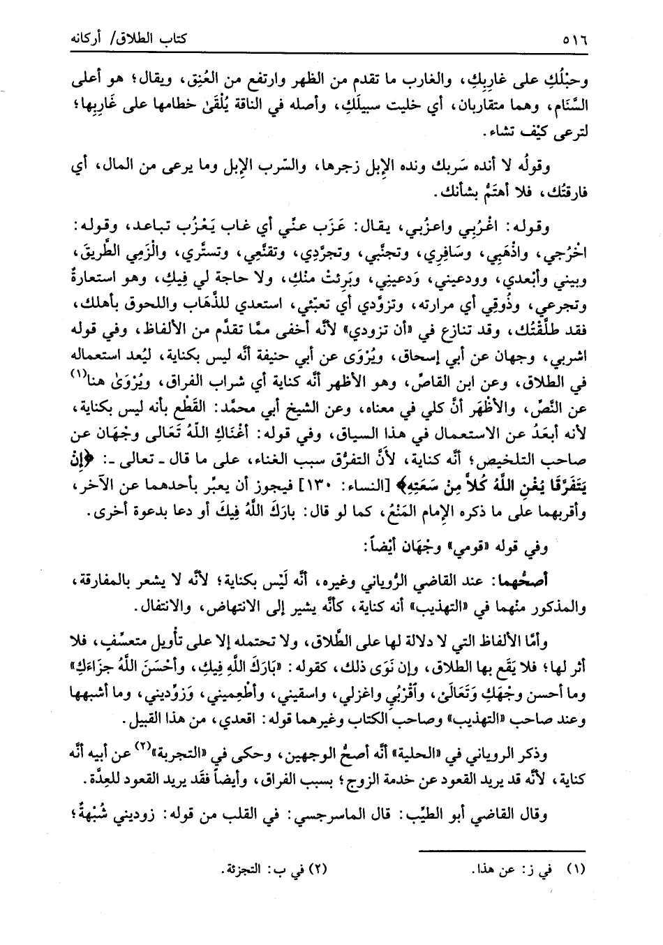وقوله: اغْرُبِي واعزُبي، يقال: عَزَب عنِّي أي غاب يَعْزُب تباعد، وقوله: اخْرُجي، واذْهَبِي، وسَافِرِي، وتجنَّبي، وتجرَّدِي، وتقنَّعِي، وتستَّري، والْزَمِي الطَّريقَ، وبيني وأبْعدي، وودعيني، وَدعينِي، وبَرِئتْ منْكِ، ولا حاجة لي فِيكِ، وهو استعارةٌ وتجرعي، وذُوقِي أي مرارته، وتزوَّدي أي تعبّئي، استعدي للذَّهَاب واللحوق بأهلك، فقد طلَّقْتُك، وقد تنازع في "أن تزودي" لأنَّه أخفى ممَّا تقدَّم من الألفاظ، وفي قوله اشربي، وجهان عن أبي إسحاق، وُيرْوَى عن أبي حنيفة أنَّه ليس بكناية، ليُعد استعماله في الطلاق، وفي ابن القاصِّ، وهو الأظهر أنَّه كناية أي شراب الفراق، وُيرْوَى هنا (¬1) عن النَّصِّ، والأظْهَر أنَّ كلي في معناه، وعن الشيخ أبي محمَّد: القَطْع بأنه ليس بكناية، لأنه أبعَدُ عن الاستعمال في هذا السياق، وفي قوله: أغْنَاكِ اللهُ تَعَالى وجْهَان عن صاحب التلخيص؛ أنَّه كناية، لأَنَّ التفرُّق سبب الغناء، على ما قال -تعالى-: {إِنْ يَتَفَرَّقَا يُغْنِ الله كُلاًّ مِنْ سَعَتِهِ} [النساء: 130] فيجوز أن يعبِّر بأحدهما عن الآخر، وأقربهما على ما ذكره الإِمام المَنْعُ، كما لو قال: بارَكَ اللهُ فِيكَ أو دعا بدعوة أخرى.