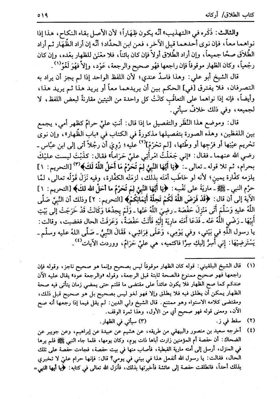 (¬1) قال الشيخ البلقيني: قوله كان الظهار موقوفاً ليس بصحيح وإنما هو صحيح ناجز، وقوله فإن راجعها فهو صحيح ممنوع فالصحة ثابتة قبل الرجعة، وقوله "والرجعة عود" يقال عليه الآن عندكم كما صح الظهار فلا يكون عائداً على مقتضى ما قلتم حتى يمضي زمان يتأتى فيه صحة الظهار يمكن أن يطلق فيه فلا يطلق وإلا فهو لغو ليس بصحيح بل هو صحيح قبل ذلك، ومقتضى كلامه الاستواء وهو ممتنع. قال الشيخ ولي الدين: لم يقل فيما إذا رجعها أنه صح الآن، ومعنى قوله فهو صحيح أي من الأول، وهذا ثمرة الوقف.