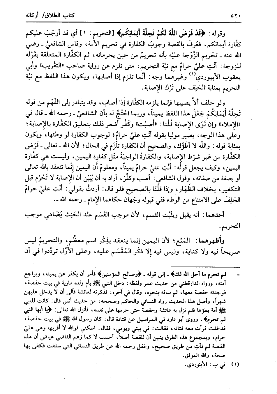 وقوله: {قَدْ فَرَضَ الله لَكُمْ تَحِلَّةَ أَيْمَانِكُمْ} [التحريم: 1] أي قد أوجَبَ عليكم كفَّارة أيمانكم، فعُرفَ بالقصة وجوبُ الكفارة في تحريم الأَمة، وقاس الشافعيُّ -رضي الله عنه- تحْريم الزَّوْجة عليْه بأنه تحريمٌ من حين يحرمانه، ثم الكفَّارة المتعلقة بقَوْله للزوجة: أنْتِ عليَّ حرامٌ مع نيَّة التحريم، متى تلزم عن رواية صاحب " التقْريب" وأبي يعقوب الأبيوردي (¬1) وغيرهما وجه: أنَّما تلزم إذا أصابها، ويكون هذا اللفظ مع نيَّة التحريم بمثابة الحَلِف على تَرْك الإِصابة.