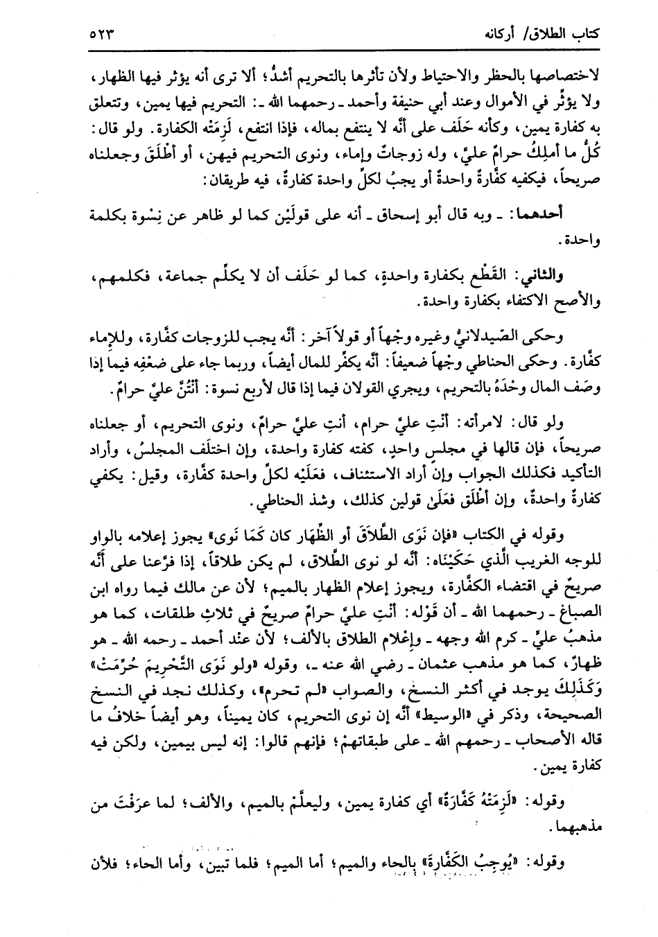 وقوله في الكتاب "فإن نَوَى الطَّلاَقَ أو الظِّهَار كان كَمَا نَوى" يجوز إعلامه بالواو للوجه الغريب الَّذي حَكَيْنَاه: أنَّه لو نوى الطَّلاق، لم يكن طلاقاً، إذا فرَّعنا على أَنَّه صريحٌ في اقتضاء الكفَّارة، ويجوز إعلام الظهار بالميم؛ لأن عن مالك فيما رواه ابن الصباغ -رحمهما الله- أن قَوْله: أنْتِ عليَّ حرام صريحٌ في ثلاثِ طلقات، كما هو مذهبُ عليٍّ -كرم الله وجهه- وإِعْلام الطلاق بالألف؛ لأن عنْد أحمد -رحمه الله- هو ظهارٌ، كما هو مذهب عثمان -رضي الله عنه-، وقوله "ولو نَوَى التَّحْرِيمَ حُرِّمَتْ" وَكَذَلِكَ يوجد في أكثر النسخ، والصواب "لم تحرم" وكذلك نجد في النسخ الصحيحة، وذكر في "الوسيط" أنه إن نوى التحريم، كان يميناً، وهو أيضاً خلافُ ما قاله الأصحاب -رحمهم الله- على طبقاتهمْ؛ فإنهم قالوا: إنه ليس بيمين، ولكن فيه كفارة يمين.
