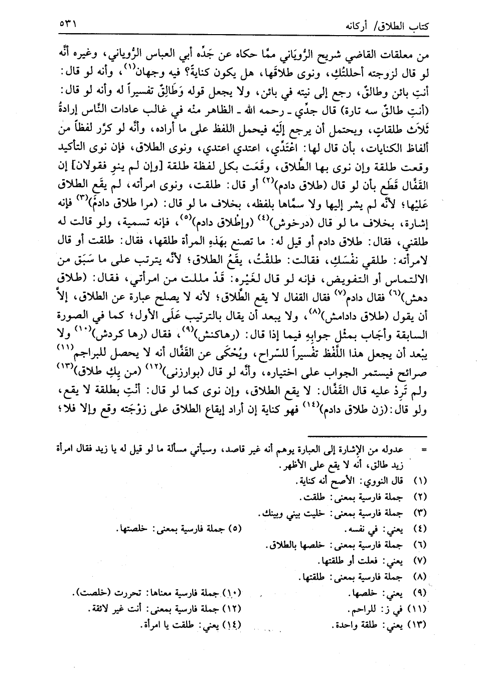 من معلقات القاضي شريح الرُّويَاني ممَّا حكاه عن جَدِّه أبي العباس الرُّوياني، وغيره أنَّه لو قال لزوجته أحللتُكِ، ونوى طلاقَها، هل يكون كنايةً؟ فيه وجهان (¬1)، وأنه لو قال: أنتِ بائن وطالقٌ، رجع إلى نيته في بائن، ولا يجعل قوله وَطَالِقٌ تفسيراً له وأنه لو قال: (أنتِ طالقٌ سه تارة) قال جدِّي -رحمه الله- الظاهر منْه في غالب عادات النَّاس إرادةُ ثَلاَث طلقاتٍ، ويحتمل أن يرجع إلَيْه فيحمل اللفظ على ما أراده، وأنَّه لو كرَّر لفظاً من ألفاظ الكنايات، بان قال لها: اعْتَدِّي، اعتدي اعتدي، ونوى الطلاق، فإن نوى التأكيد وقعت طلقة وإن نوى بها الطَّلاق، وقَعَت بكل لفظة طلقة [وإن لم ينوِ فقولان] إن القَفَّال قَطَع بأن لو قال (طلاق دادم) (¬2) أو قال: طلقت، ونوى امرأته، لم يقَعِ الطلاق عَليْها؛ لأَنَّه لم يشر إليها ولا سمَّاها بلفظه، بخلاف ما لو قال: (مرا طلاق دادمْ) (¬3) فإنه إشارة، بخلاف ما لو قال (درخوش) (¬4) (وإطْلاق دادم) (¬5)، فإنه تسمية، ولو قالت له طلقني، فقال: طلاق دادم أو قيل له: ما تصنع بهَذهِ المرأة طلقها، فقال: طلقت أو قال لامرأته: طلقي نفْسَكِ، فقالت: طلقْتُ، يقَعُ الطلاق؛ لأنَّه يترتب على ما سَبَق من الالتماس أو التفويض، فإنه لو قال لغَيْره: قَدْ مللت من امرأتي، فقال: (طلاق دهش) (¬6) فقال دادم (¬7) فقال القفال لا يقع الطَّلاق؛ لأنه لا يصلح عبارة عن الطلاق، إلاَّ أن يقول (طلاق دادامش) (¬8)، ولا يبعد أن يقال بالترتيب عَلَى الأول؛ كما في الصورة السابقة وأجَاب بمثْل جوابِهِ فيما إذا قال: (رهاكنش) (¬9)، فقال (رها كردش) (¬10) ولا يبْعد أن يجعل هذا اللَّفْظ تفْسيراً للسّراح، ويُحْكَى عن القَفَّال أنه لا يحصل للبراجم (¬11) صرائح فيستمر الجواب على اختياره، وأنَّه لو قال (بوارزنى) (¬12) (من يِكِ طلاق) (¬13) ولم تَرِدْ عليه قال القَفَّال: لا يقع الطلاق، وإن نوى كما لو قال: أنْتِ بطلقة لا يقع، ولو قال: (زن طلاق دادم) (¬14) فهو كناية إن أراد إيقاع الطلاق على زوْجَته وقع وإلا فلا؛