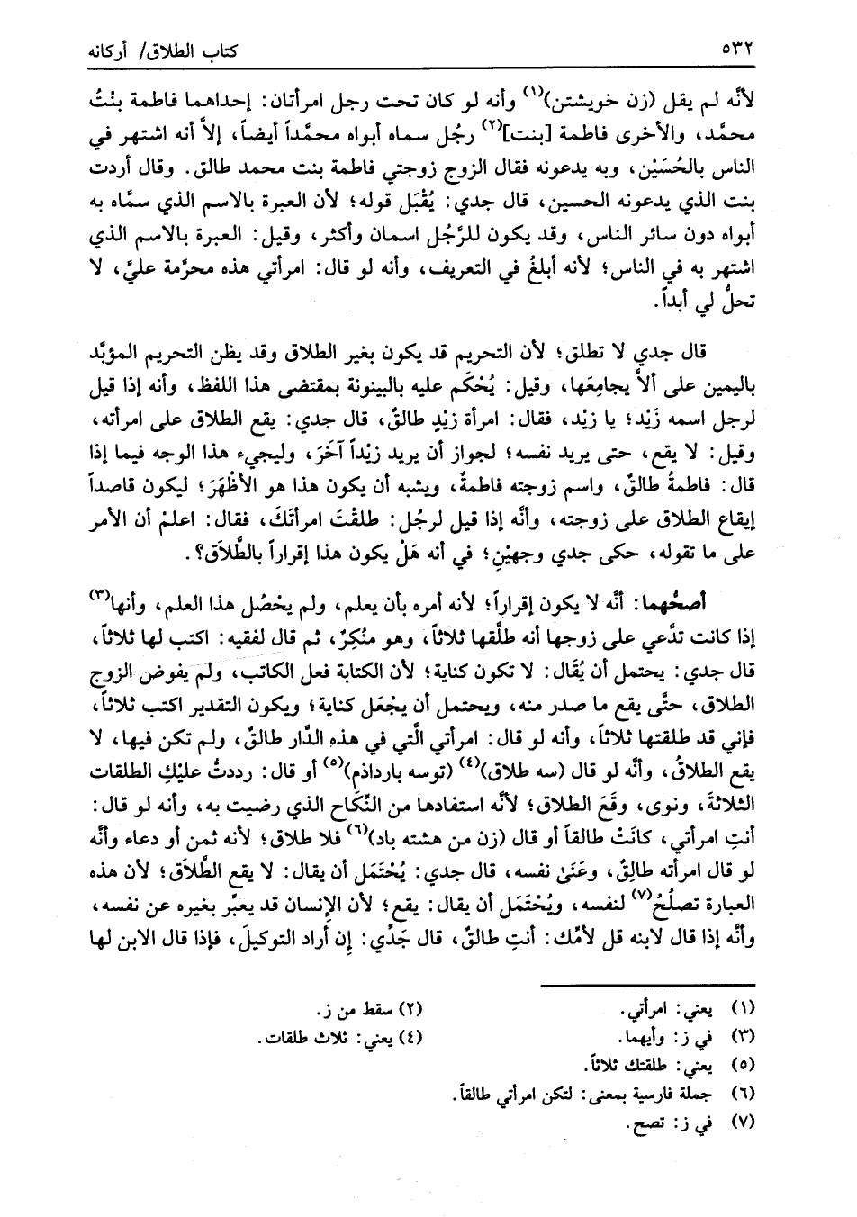 أصحُّهما: أنَّه لا يكون إقراراً؛ لأنه أمره بأن يعلم، ولم يحْصُل هذا العلم، وأنها (¬3) إذا كانت تدَّعي على زوجها أنه طلَّقها ثلاثاً، وهو منُكِرٌ، ثم قال لفقيه: اكتب لها ثلاثاً، قال جدي: يحتمل أن يُقَال: لا تكون كناية؛ لأن الكتابة فعل الكاتب، ولم يفوض الزوج الطلاق، حتَّى يقع ما صدر منه، ويحتمل أن يجْعَل كناية؛ ويكون التقدير اكتب ثلاثاً، فإني قد طلقتها ثلاثاً، وأنه لو قال: امرأتي الَّتي في هذا الدَّار طالقٌ، ولم تكن فيها، لا يقع الطلاقُ، وأنَّه لو قال (سه طلاق) (¬4) (توسه بارداذم) (¬5) أو قال: رددتُّ عليْكِ الطلقات الثلاثةَ، ونوى، وقَعَ الطلاق؛ لأنَّه استفادها من النِّكَاح الذي رضيت به، وأنه لو قال: أنتِ امرأتي، كانَتْ طالقاً أو قال (زن من هشته باد) (¬6) فلا طلاق؛ لأنه ثمن أو دعاء وأنَّه لو قال امرأته طالِقٌ، وعَنَى نفسه، قال جدي: يُحْتَمَل أن يقال: لا يقع الطَّلاَق؛ لأن هذه العبارة تصلُحُ (¬7) لنفسه، ويُحْتَمَل أن يقال: يقع؛ لأن الإِنسان قد يعبِّر بغيره عن نفسه، وأنَّه إذا قال لابنه قل لأمِّك: أنتِ طالقٌ، قال جَدِّي: إِن أَراد التوكيلَ، فإذا قال الابن لها
