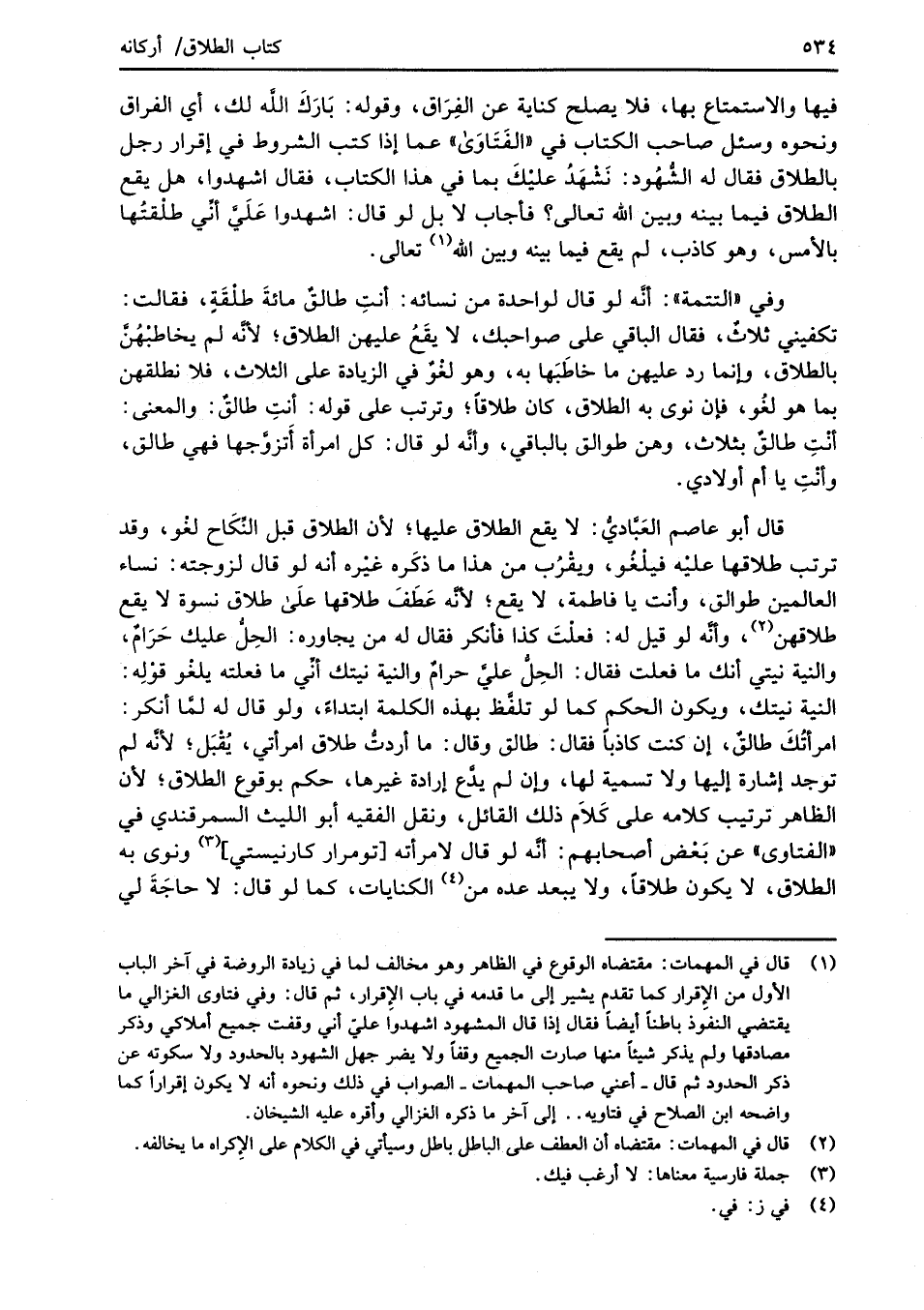 قال أبو عاصم العَبَّاديُّ: لا يقع الطلاق عليها؛ لأن الطلاق قبل النِّكَاح لغو، وقد ترتب طلاقها عليْه فيلْغُو، ويقْرُب من هذا ما ذكَره غيْره أنه لو قال لزوجته: نساء العالمين طوالق، وأنت يا فاطمة، لا يقع؛ لأنَّه عَطَفَ طلاقها عَلَى طلاق نسوة لا يقع طلاقهن (¬2)، وأنَّه لو قيل له: فعلْتَ كذا فأنكر فقال له من يجاوره: الحِلُّ عليك حَرَامٌ، والنية نيتي أنك ما فعلت فقال: الحِلُّ عليَّ حرامٌ والنية نيتك أنِّي ما فعلته يلغْو قوْلِه: النية نيتك، ويكون الحكم كما لو تلفَّظ بهذه الكلمة ابتداءً، ولو قال له لمَّا أنكر: امرأتُكَ طالقٌ، إن كنت كاذباً فقال: طالق وقال: ما أردتُّ طلاق امرأتي، يُقْبَل؛ لأنَّه لم توجد إشارة إليها ولا تسمية لها، وإن لم يدع إرادة غيرها، حكم بوقوع الطلاق؛ لأن الظاهر ترتيب كلامه على كَلاَم ذلك القائل، ونقل الفقيه أبو الليث السمرقندي في "الفتاوى" عن بَعْض أصحابهم: أنَّه لو قال لامرأته [تومرار كارنيستي] (¬3) ونوى به الطلاق، لا يكون طلاقاً، ولا يبعد عده من (¬4) الكنايات، كما لو قال: لا حاجَةَ لي