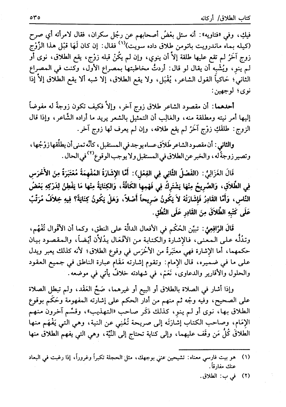 قَالَ الغَزَالِيُّ: (الفَصْلُ الثَّانِي فِي الفِعْلِ): أَمَّا الإِشَارَةُ المُفْهِمَةُ مُعْتَبَرَةٌ مِنَ الأَخْرَسِ فِي الطَّلاَقِ، وَالصَّرِيحُ مِنْهَا يَشْتَرِك في فَهْمِهِا الكَافَّةُ، وَالكِنَايَةُ مِنْها مَا يَفْطِنُ لِدَرْكِهِ بَعْضُ النَّاسِ، وَأَمَّا القَادِرُ فَإِشَارَتُهُ لاَ يَكُونُ صَرِيحاً أَصْلاً، وَهَلْ يَكُونُ كِنَايَةً؟ فِيهِ خِلاَفٌ مُرَتَّبٌ عَلَى كَتْبِهِ الطَّلاَقَ مِنَ القَادِرِ عَلَى النُّطْقِ.