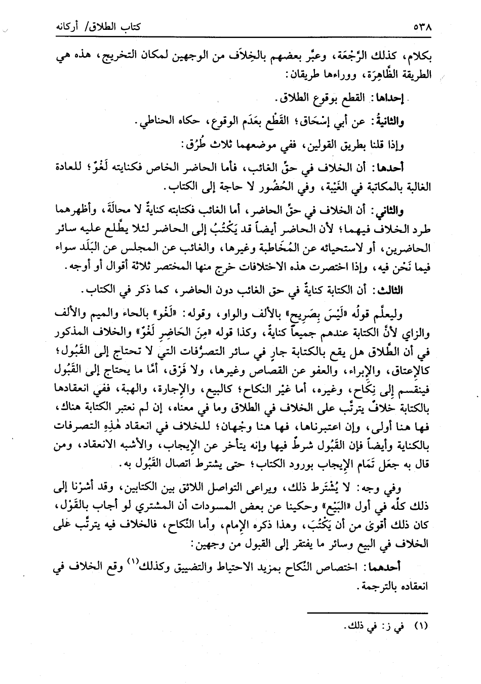 والثاني: أن الخلاف في حقِّ الحاضر، أما الغائب فكتابته كنايةٌ لا محالَةَ، وأظهرهما طرد الخلاف فيهما؛ لأن الحاضر أيضاً قد يَكْتُبُ إلى الحاضر لئلا يطَّلع عليه سائر الحاضرين، أو لاستحيائه عن المُخَاطبة وغيرها، والغائب عن المجلس عن البَلَد سواء فيما نَحْن فيه، وإذا اختصرت هذه الاختلافات خرج منها المختصر ثلاثة أقوال أو أوجه.