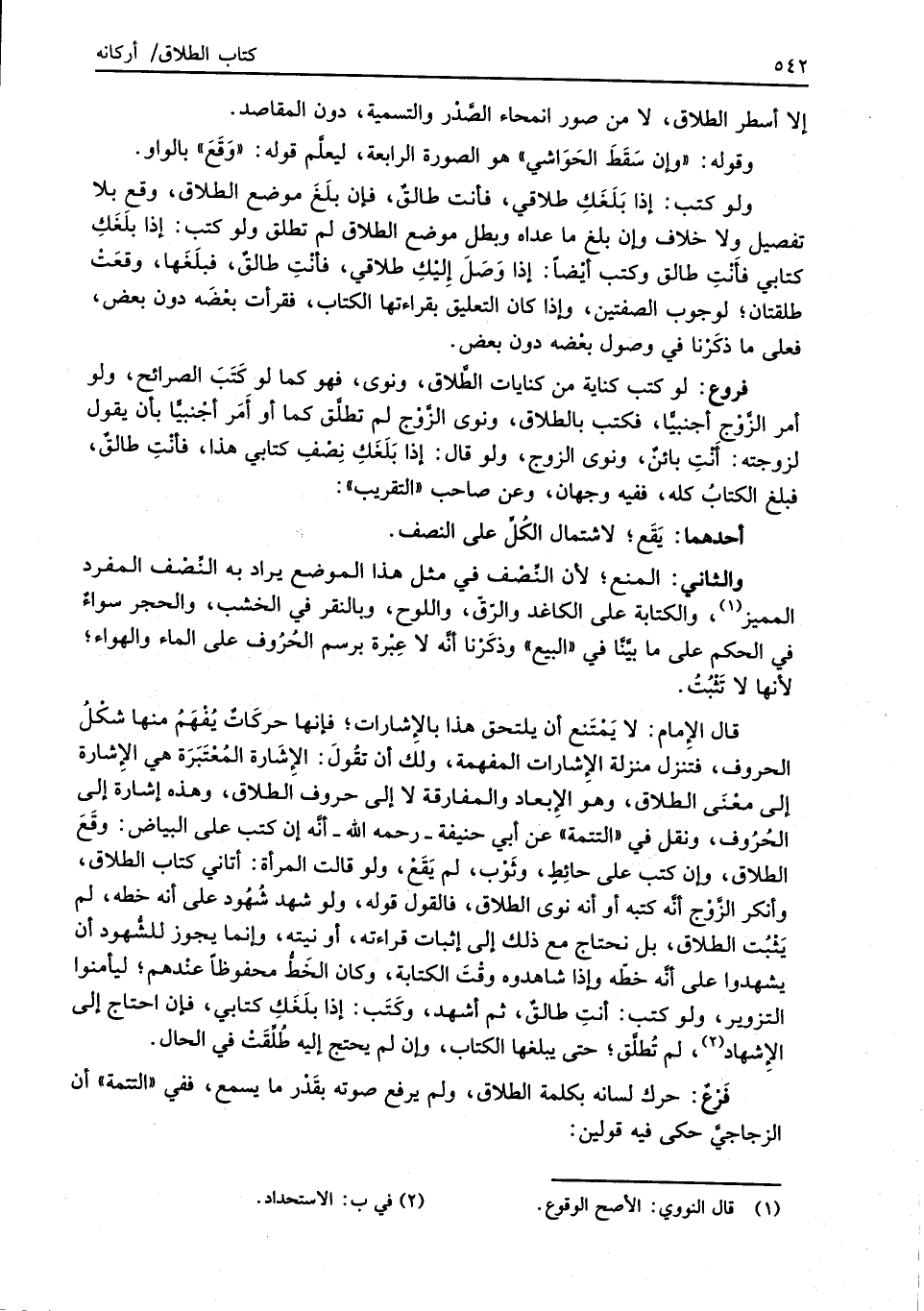 قال الإِمام: لا يَمْتَنع أن يلتحق هذا بالإِشارات؛ فإنها حركَاتٌ يُفْهَمُ منها شكْلُ الحروف، فتنزل منزلة الإِشارات المفهمة، ولكَ أن تقُولَ: الإِشَارة المُعْتَبَرَة هي الإِشارة إلى معْنَى الطلاق، وهو الإِبعاد والمفارقة لا إلى حروف الطلاق، وهذه إشارة إلى الحُرُوف، ونقل في "التتمة" عن أبي حنيفة -رحمه الله- أنَّه إن كتب على البياض: وقَعَ الطلاق، وإن كتب على حائِطٍ، وثَوْب، لم يَقَعْ، ولو قالت المرأة: أتاني كتاب الطلاق، وأنكر الزَّوْج أنَّه كتبه أو أنه نوى الطلاق، فالقول قوله، ولو شهد شُهُود على أنه خطه، لم يَثْبُت الطلاق، بل نحتاج مع ذلك إلى إثبات قراءته، أو نيته، وإنما يجوز للشُّهود أن يشهدوا على أنَّه خطّه وإذا شاهدوه وقْتَ الكتابة، وكان الخَطُّ محفوظاً عنْدهم؛ ليأمنوا التزوير، ولو كتب: أنتِ طالقٌ، ثم أشهد، وكَتَب: إذا بلَغَكِ كتابي، فإن احتاج إلى الإِشهاد (¬2)، لم تُطلَّق؛ حتى يبلغها الكتاب، وإن لم يحتج إليه طُلِّقَت في الحال.