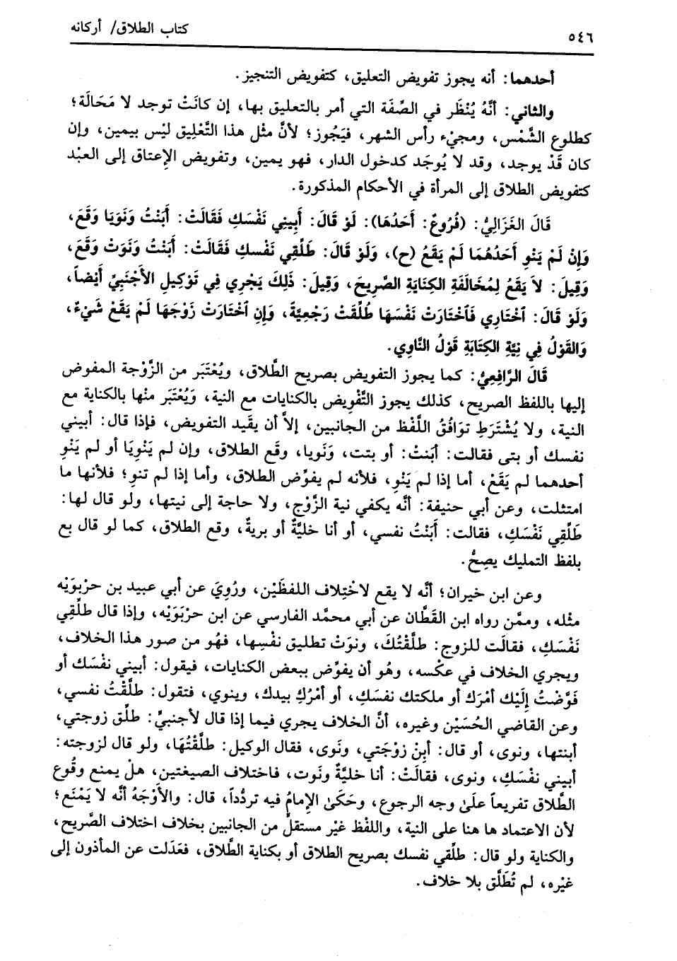 قَالَ الغَزَالِيُّ: (فُرُوعٌ: أَحَدُهَا): لَوْ قَالَ: أَبِينِي نَفْسَكِ فَقَالَتْ: أَبَنْتُ وَنَوَيَا وَقَعَ، وَإِنْ لَمْ يَنوِ أَحَدُهُمَا لَمْ يَقَعُ (ح)، وَلَوْ قَالَ: طَلِّقِي نَفْسكِ فَقَالَتْ: أَبنْتُ وَنَوَتْ وَقَعَ، وَقِيلَ: لاَ يَقَعُ لِمُخَالَفَةِ الكِنَايَةِ الصَّرِيحَ، وَقِيلَ: ذَلِكَ يَجْرِي في تَوْكِيلِ الأَجْنَبِيِّ أَيْضاً، وَلَوْ قَالَ: اخْتَارِي فَاخْتَارَتْ نَفْسَهَا طُلِّقَتْ رَجْعِيَّةً، وَإِنِ اخْتَارَتْ زَوْجَهَا لَمْ يَقَعْ شَيْءٌ، وَالقَوْلُ فِي نِيَّةِ الكتَابَةِ قَوْلُ النَّاوِي.