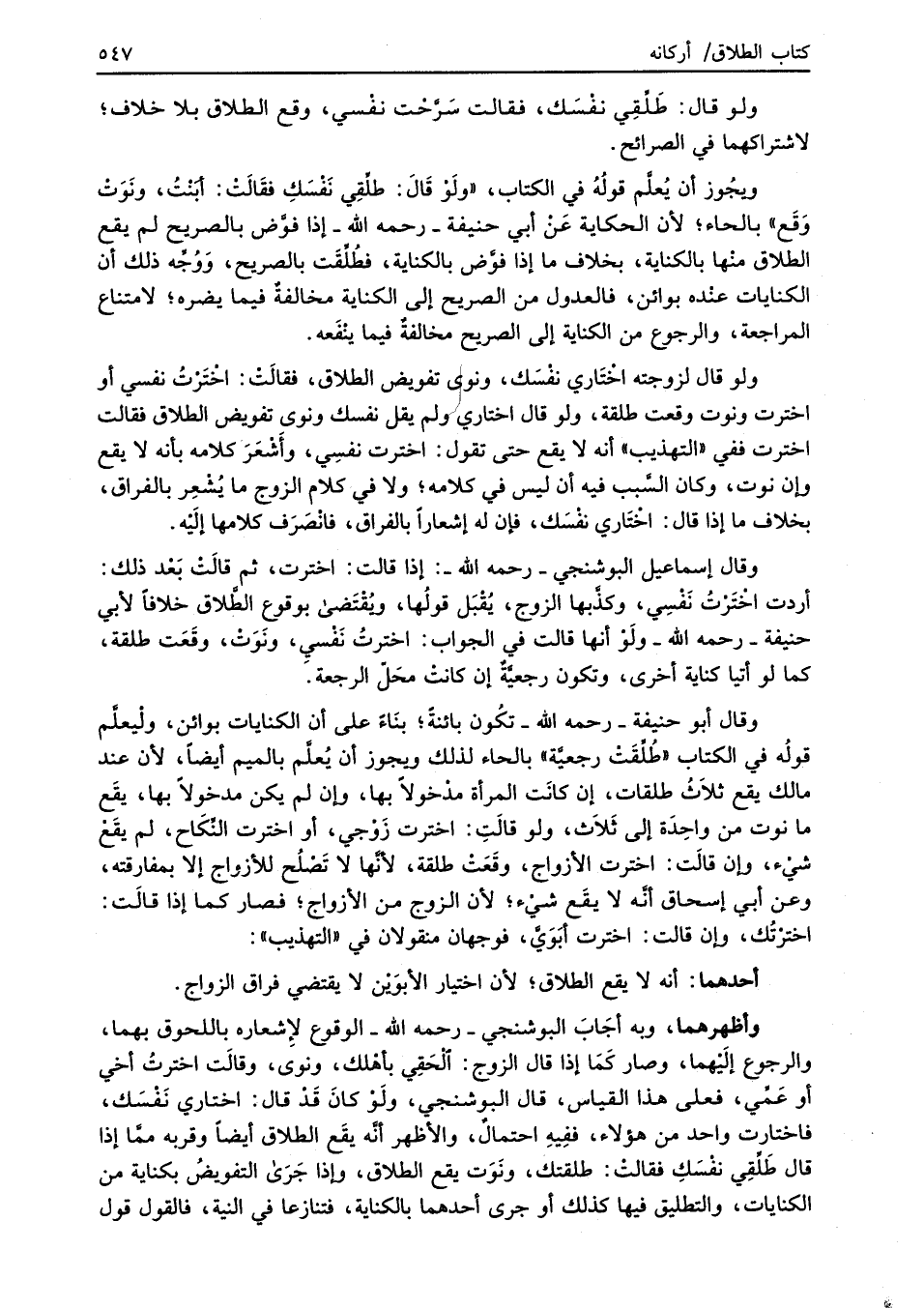 وقال أبو حنيفة -رحمه الله- تكُون بائنةً؛ بنَاءً على أن الكنايات بوائن، ولْيعلَّم قولُه في الكتاب "طُلِّقَتْ رجعيَّة" بالحاء لذلك ويجوز أن يُعلَّم بالميم أيضاً, لأن عند مالك يقع ثلاَثُ طلقات، إن كانَت المرأة مدْخولاً بها، وإن لم يكن مدخولاً بها، يقَع ما نوت من واحِدَة إلى ثَلاَث، ولو قالَتِ: اخترت زَوْجي، أو اخترت النِّكَاح، لم يقَعْ شيْء، وإن قالَت: اخترت الأزواج، وقَعَتْ طلقة؛ لأنَّها لا تَصْلُح للأزواج إلا بمفارقته، وعن أبي إسحاق أنَّه لا يقَع شيْء؛ لأن الزوج من الأزواج؛ فصار كما إذا قالَت: اخترْتُك، وإن قالت: اخترت أبَوَيَّ، فوجهان منقولان في "التهذيب":