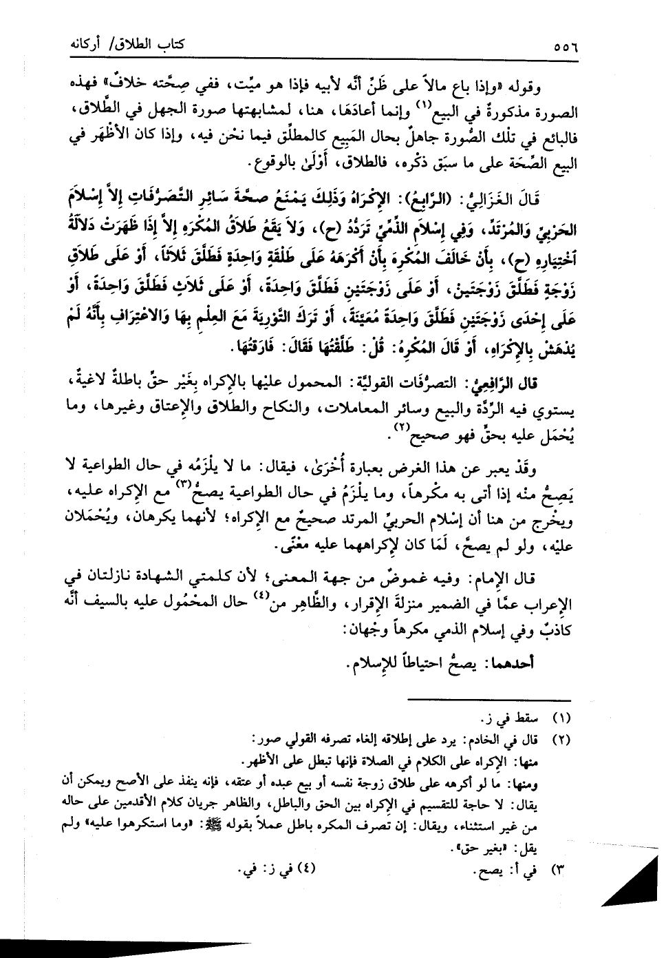 قَالَ الغَزَالِيُّ: (الرَّابِعُ): الإِكْرَاهُ وَذَلِكَ يَمْنَعُ صحَّةَ سَائِرِ التَّصَرُّفَاتِ إلاَّ إِسْلاَمَ الحَرْبِيِّ وَالمُرْتَدِّ، وَفِي إِسْلاَمِ الذِّمِّيِّ تَرَدُّدُ (ح)، وَلاَ يَقَعُ طَلاَقُ المُكْرَهِ إلاَّ إِذَا ظَهَرَتْ دَلالَةُ اخْتِيَارِهِ (ح)، بِأَنْ خَالَفَ المُكْرِهَ بِأَنْ أَكْرَهَهُ عَلَى طَلْقَةٍ وَاحِدَةٍ فَطَلَّقَ ثَلاَثاً، أَوْ عَلَى طَلاَقِ زَوْجَةٍ فَطَلَّقَ زَوْجَتَينْ، أَوْ عَلَى زَوْجَتَيْنِ فَطَلَّقَ وَاحِدَةً، أَوْ عَلَى ثَلاَثٍ فَطَلَّقَ وَاحِدَةً، أَوْ عَلَى إِحْدَى زَوْجَتَيْنِ فَطَلَّقَ وَاحِدَةً مُعَينَةً، أَوْ تَرَكَ التَّوْرِيَةَ مَعَ العِلْمِ بِهَا وَالاعْتِرَافِ بِأَنَّهُ لَمْ يُدْهَشْ بِالإِكْرَاهِ، أَوْ قَالَ المُكْرِهُ: قل: طَلَّقْتُهَا فَقَالَ: فَارَقتُهَا.