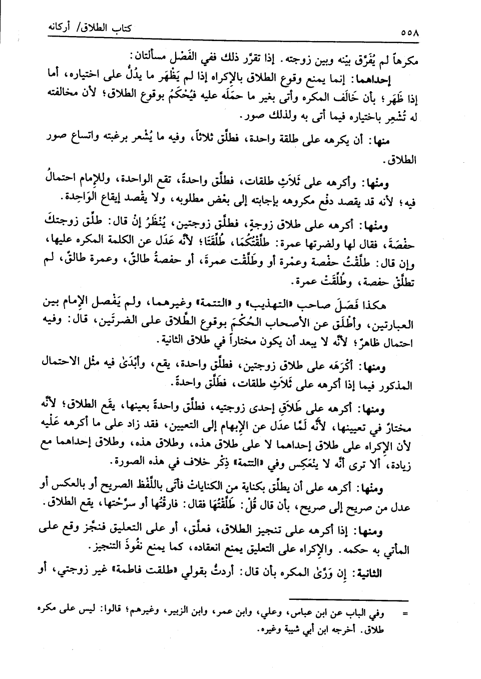 ومنْها: أكرهه على طلاق زوجةٍ، فطلَّق زوجتين، يُنْظَرُ إنْ قال: طلَّق زوجتكَ حفْصَةَ، فقال لها ولضرتها عمرة: طلَّقْتُكُمَا، طُلِّقَتَا؛ لأنَّه عَدَل عن الكلمة المكره عليها، وإن قال: طلَّقْتُ حفْصة وعمْرة أو وطَلَّقْت عمرةَ، أو حفصةُ طالقٌ، وعمرة طالقٌ، لم تطلَّقْ حفصة، وطُلِّقَتْ عمرة.