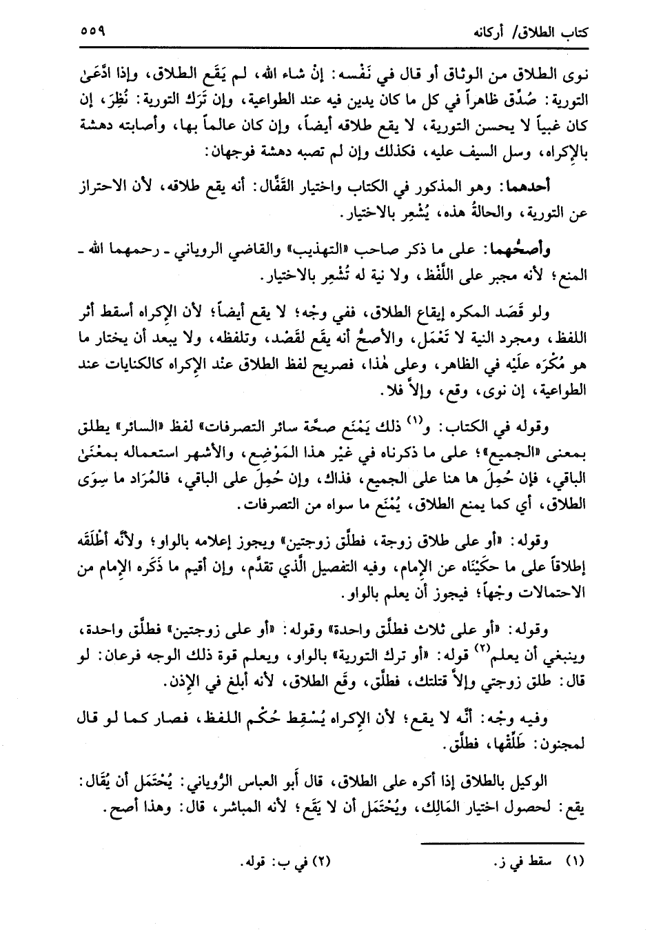 نوى الطلاق من الوثاق أو قال في نَفْسه: إنْ شاء الله، لم يَقَع الطلاق، وإذا ادَّعَى التورية: صُدِّق ظاهراً في كل ما كان يدين فيه عند الطواعية، وإن تَرَك التورية: نُظِرَ، إن كان غبياً لا يحسن التورية، لا يقع طلاقه أيضاً، وإن كان عالماً بها، وأصابته دهشة بالإِكراه، وسل السيف عليه، فكذلك وإن لم تصبه دهشة فوجهان: