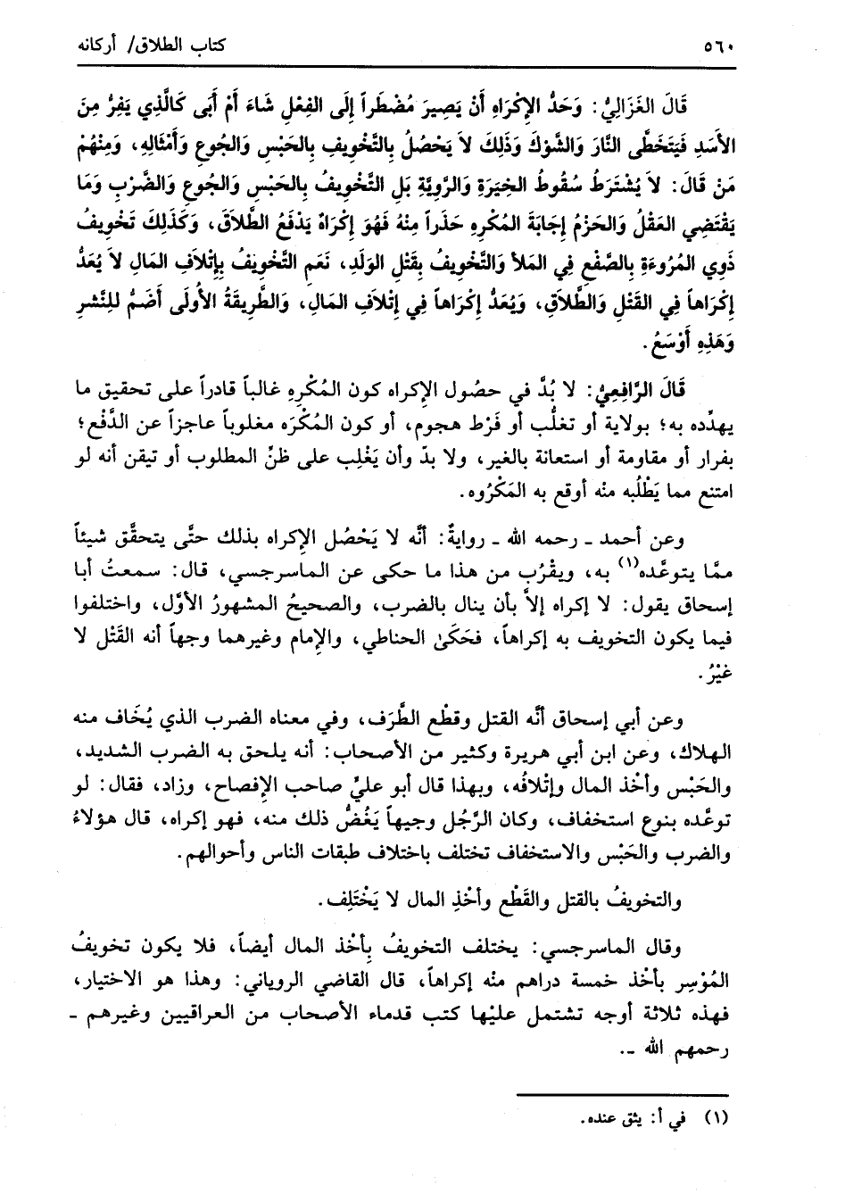 وعن أبي إسحاق أنَّه القتل وقطْع الطَّرَف، وفي معناه الضرب الذي يُخَاف منه الهلاك، وعن ابن أبي هريرة وكثير من الأصحاب: أنَّه يلحق به الضرب الشديد، والحَبْس وأخْذ المال وإتْلافُه، وبهذا قال أبو عليٍّ صاحب الإِفصاح، وزاد، فقال: لو توعَّده بنوع استخفاف، وكان الرَّجُل وجيهاً يَغُضُّ ذلك منه، فهو إكراه، قال هؤلاءُ والضرب والحَبْس والاستخفاف تختلف باختلاف طبقات الناس وأحوالهم.