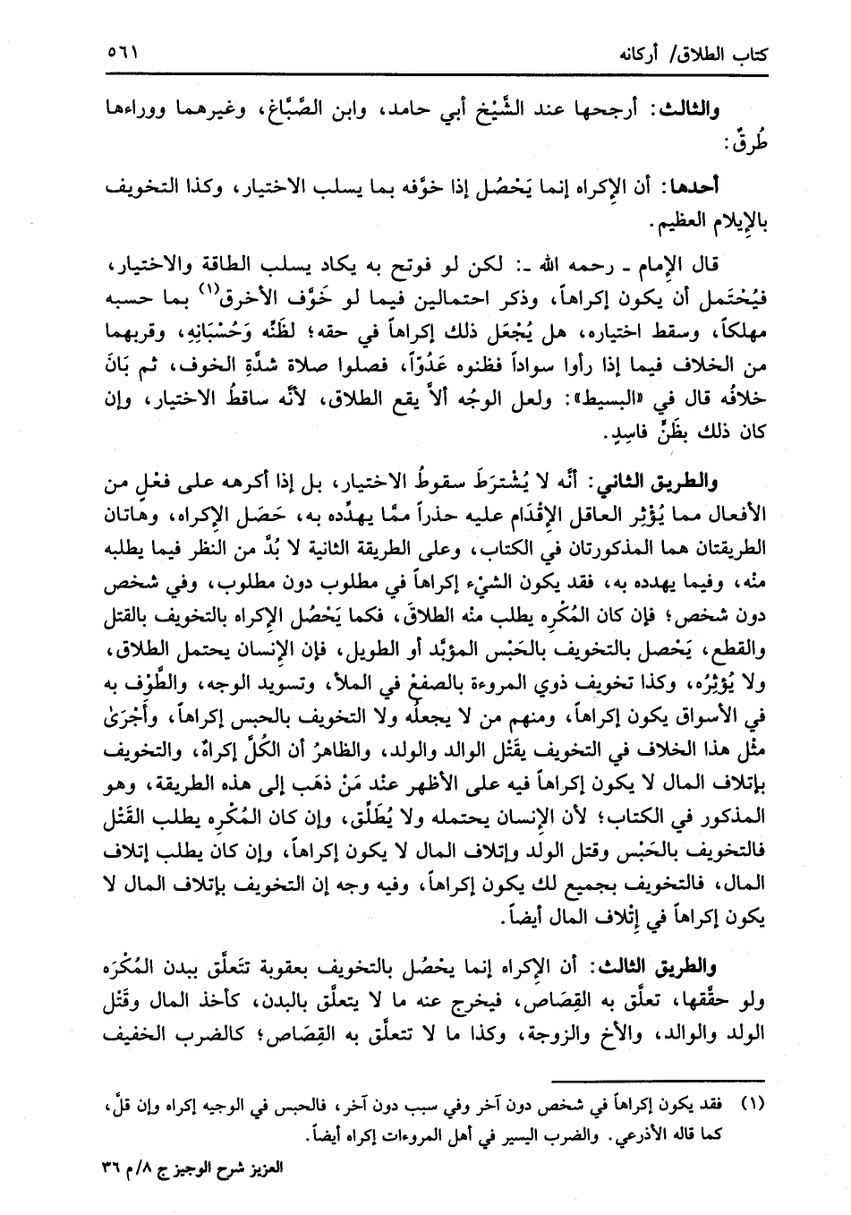 والطريق الثاني: أنَّه لا يُشْترَطَ سقوطُ الاختيار، بل إذا أكرهه على فعْلٍ من الأفعال مما يُؤْثِر العاقل الإِقْدَام عليه حذراً ممَّا يهدِّده به، حَصَل الإِكراه، وهاتان الطريقتان هما المذكورتان في الكتاب، وعلى الطريقة الثانية لا بُدَّ من النظر فيما يطلبه منْه، وفيما يهدده به، فقد يكون الشيْء إكراهاً في مطلوب دون مطلوب، وفي شخص دون شخص؛ فإن كان المُكْرِه يطلب منْه الطلاقَ، فكما يَحْصُل الإِكراه بالتخويف بالقتل والقطع، يَحْصل بالتخويف بالحَبْس المؤبَّد أو الطويل، فإن الإِنسان يحتمل الطلاق، ولا يُؤثِرُه، وكذا تخويف ذوي المروءة بالصفعْ في الملأ، وتسويد الوجه، والطَّوْف به في الأسواق يكون إكراهاً، ومنهم من لا يجعله ولا التخويف بالحبس إكراهاً، وأَجْرَى مثْل هذا الخلاف في التخويف يقَتْل الوالد والولد، والظاهرُ أن الكُلَّ إكراهٌ، والتخويف بإتلاف المال لا يكون إكراهاً فيه على الأظهر عنْد مَنْ ذهَب إلى هذه الطريقة، وهو المذكور في الكتاب؛ لأن الإنسان يحتمله ولا يُطَلِّق، وإن كان المُكْرِه يطلب القَتْل فالتخويف بالحَبْس وقتل الولَد وإتلاف المال لا يكون إكراهاً، وإن كان يطلب إتلاف المال، فالتخويف بجميع لك يكون إكراهاً، وفيه وجه إن التخويف بإتلاف المال لا يكون إكراهاً في إِتلاف المال أيضاً.
