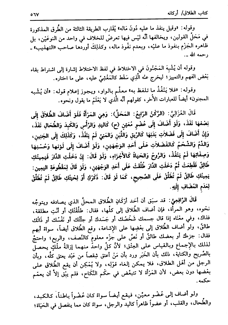 قَالَ الرَّافِعِيُّ: قد سبَق أن أحَد أرْكَانِ الطَّلاق المحلُّ الذي يصادفه ويتوجَّه نحْوه، وهو المرأة، فإن أضاف الطَّلاق إلى كلِّها، فقال: طلَّقْتُكِ أو أنْتِ مطلقة، فذاك، وفي معْنَاه إذا قال جسمك شَخْصُك أو جَسَدك أو جثَّتُك أو نَفْسُك أو ذَاتُك طالقٌ، ولو أضاف الطَّلاق إلى بعْضِها على الإِشاعة، وقع الطَّلاق أيضاً، سواءٌ أبهم فقال: جزءك أو بعضك طالقٌ أو نَصَّ على جزْء معلومٍ كالنِّصف، والربع؛ واحتجَّ لذلك بالإِجماع وبالقياس على العِتْق؛ لأنَّ كلَّ واحد منهما إزالةُ ملْكٍ يحصل بالصَّريح والكناية، ذلك بأن الخَبَر ورد بأن من أعتق شِقصاً من عَبْد يعتق كلُّه، وبأن الرجل من أهْل الطلاق، فلا يمكن إلغاء قوْلِه، ولا يُمْكِن أن يقع الطَّلاق على بعْضها دون بعض؛ لأنَّ المَرْأة لا تتبعَّض في حكْم النِّكَاح، فلم يبْق إلاَّ أن يعمَّم حكمه.