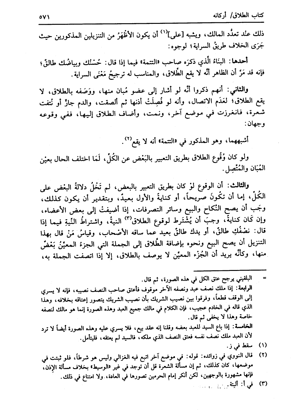 والثالث: أن الوقوع لوْ كان بطريق التعبير بالبعض، لم تَخْلُ دلالةُ البعْض على الكُلِّ، إما أن تكُونَ صريحاً، أو كنايةً والأول بعيدٌ، وبتقدير أن يكون كذلك، وجَب أن يصح النِّكاح والبيع وسائر التصرفات، إذا أضيفتْ إلى بعض الأعضاء، وإن كَان كنايةً، وجبَ أن يُشْتَرط لوقوع الطلاق (¬3) النيةُ، واشتراطُ النِّيةِ فيما إذا قال: نصْفُكِ طالقٌ، أو يدك طالقٌ بعيد عما ساقه الأصْحاب، وقياسُ مَنْ قال بهذا التنزيل أن يصحُّ البيع ونحوه بإضافة الطَّلاق إلى الجملة التي الجزءُ المعيَّنُ بَعْضٌ منها، وكأنَّه يريد أن الجُزْء المعين لا يوصف بالطلاق، إلا إذا اتصفت الجملة به،