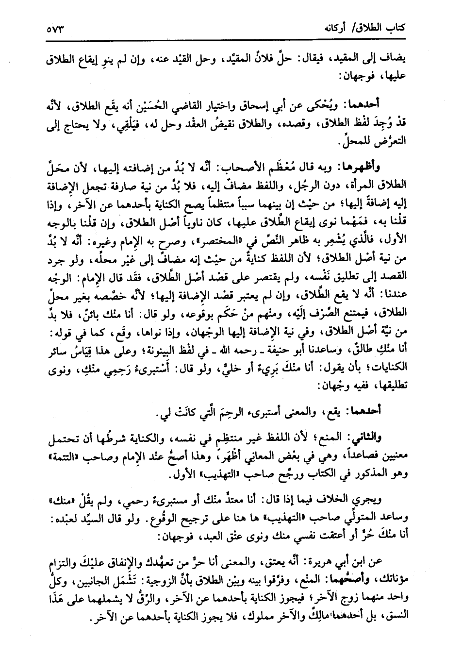 وأظهرها: وبه قال مُعْظَم الأصحاب: أنَّه لا بُدَّ من إضافته إليها؛ لأن محَلَّ الطلاق المرأة، دون الرجُل، واللفظ مضافٌ إليه، فلا بُدَّ من نية صارفة تجعل الإِضافة إليه إضافةً إليها؛ من حيْث إن بينهما سبباً منتظماً يصحُّ الكناية بأحدهما عن الآخر، وإذا قلْنا به، فمَهْما نوى إيقاع الطَّلاق عليها، كان ناوياً أصْل الطَّلاق، وإن قلْنا بالوجه الأول، فالَّذي يُشْعِر به ظاهر النَّصِّ في "المختصر"، وصرح به الإِمام وغيره: أنَّه لا بُدَّ من نية أصْل الطلاق؛ لأن اللفظ كنايةٌ من حيْث إنَّه مضافٌ إلى غيْر محلِّه، ولو جرد القصد إلى تطليق نَفْسه، ولم يقتصر على قصْد أصْل الطَّلاق، فقَد قال الإِمام: الوجْه عندنا: أنَّه لا يقع الطَّلاق، وإن لم يعتبر قصْد الإضافة إليها؛ لأنَّه خصَّصه بغير محلِّ الطَّلاق، فيمتنع الصَّرْف إلَيْه، ومنْهم منْ حَكَم بوقَوعه، ولو قال: أنا منْك بائنٌ، فلا بدَّ من نيَّة أصْل الطلاق، وفي نية الإِضافة إليها الوجْهان، وإذا نواها، وقَع، كما في قوله: أنا منْكِ طالقٌ، وساعدنا أبو حنيفة -رحمه الله- في لفْظ البينونة؛ وعلى هذا قِيَاسُ سائر الكنايات؛ بأن يقول: أنا منْكَ بَرِيءٌ أو خليٌّ، ولو قال: أَسْتبرئُ رَحِمِي منْكِ، ونوى تطليقها، ففيه وجْهان: