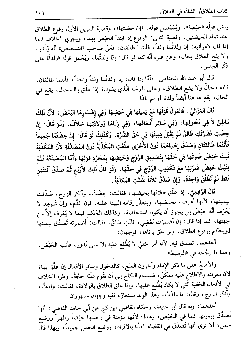 قَالَ الغَزَالِىُّ: فَالقَوْلُ قَوْلُهَا مَعَ يَمِينها في حَيْضِهَا وَفِي إِضْمَارِهَا البَعْضَ؛ لأَنَّ ذَلِكَ بَاطِنٌ لاَ فِي دُخُولِهَا، وَفِي سَائِر أَفْعَالِهَا، وَفِي زنَاهَا وَوِلاَدَتِهَا خِلاَفٌ، وَلَوْ قَالَ: إِنْ حِضْتِ فَضَرَّتُكِ طَالِقٌ لَمْ يُقْبَلْ يَمِينُهَا في حَقّ الضَّرَّةِ، وَكَذَلِكَ لَوْ قَالَ: إِنْ حِضْتُمَا جَمِيعاً فَأَنْتُمَا طَالِقَتَانِ وَصَدَّقَ إِحْدِاهُمَا دُونَ الأُخْرَى طُلِّقَتِ المُكَذَّبَةُ دُونَ المُصَدَّقَةِ لأَنَّ المُكَذَّبَةُ ثَبَتَ حَيْضُ ضَرتِّها في حَقِّهَا بِتَصْدِيقِ الزَّوْجِ وَحَيْضِهَا بِمُجَرَّدِ قَوْلِهَا وَأَمَّا المُصَدَّقَةَ فَلَمْ يَثْبُتْ حَيضُ ضَرَّتِهَا مَعَ تَكْذِيبِ الزَّوْجِ في حَقِّهَا، وَلَوْ قَالَ ذَلِكَ لأرْبَعٍ ثُمَّ صَدَّقَ اثْنَتَيْنِ فَقَطْ لَمْ تُطَلَّقْ وَاحِدَةٌ، وإِنْ صَدَّقَ ثَلاَثاً طُلِّقَتِ المُكَذَّبَةُ.