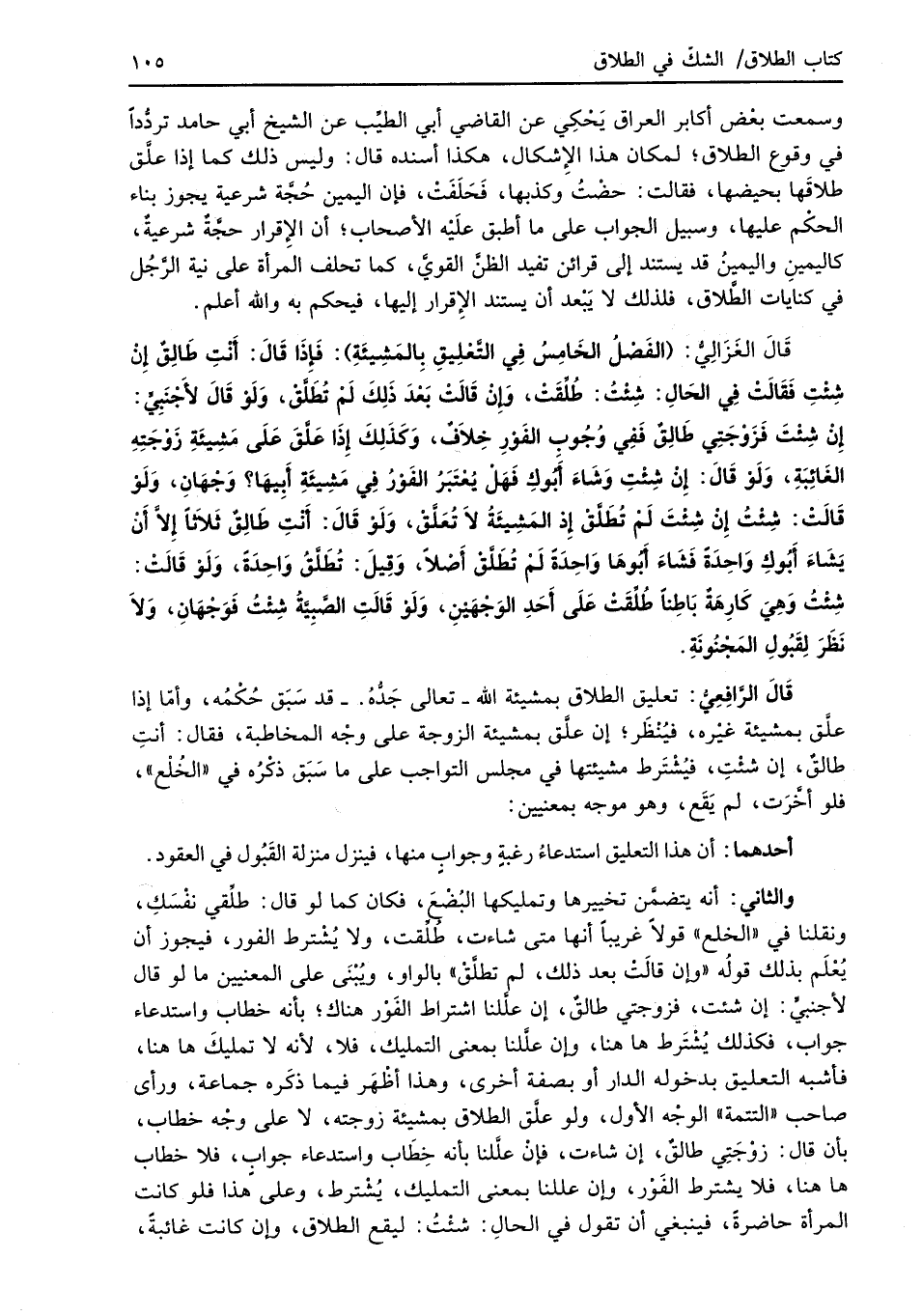قَالَ الغَزَالِيُّ: (الفَصْلُ الخَامِسُ في التَّعْلِيقِ بِالمَشِيئَةِ): فَإِذَا قَالَ: أَنْتِ طَالِقٌ إِنْ شِئْتِ فَقَالَتْ فِي الحَالِ: شِئْتُ: طُلِّقَتْ، وَإِنْ قَالَتْ بَعْدَ ذَلِكَ لَمْ تُطَلَّق، وَلَوْ قَالَ لأجْنَبِىٍّ: إِنْ شِئْتَ فَزَوْجَتِي طَالِقٌ فَفِي وُجُوب الفَوْرِ خِلاَفٌ، وَكَذَلِكَ إِذَا عَلَّقَ عَلَى مَشِيئَةِ زَوْجَتِهِ الغَائِبَةِ، وَلَوْ قَالَ: إِنْ شِئْتِ وَشَاءَ أبُوكِ فَهَلْ يُعْتَبَرُ الفَوْرُ في مَشِيئَةِ أَبِيهَا؟ وَجْهَانِ، وَلَوْ قَالَتْ: شِئْتُ إِنْ شِئْتَ لَمْ تُطَلَّقْ إِذ المَشِيئَةُ لاَ تُعَلَّقْ، وَلَوْ قَالَ: أَنْتِ طَالِقٌ ثَلاَثاً إلاَّ أَنْ يَشَاءَ أَبُوكِ وَاحِدَةً فَشَاءَ أَبُوهَا وَاحِدَةً لَمْ تُطَلَّقْ أَصْلاً، وَقِيلَ: تُطَلَّقُ وَاحِدَةً، وَلَوْ قَالَتْ: شِئْتُ وَهِيَ كَارِهَةٌ بَاطِناً طُلِّقَتْ عَلَى أَحَدِ الوَجْهَيْنِ، وَلَوْ قَالَتِ الصَّبِيَّةُ شِئْتُ فَوَجْهَانِ، وَلاَ نَظَرَ لِقَبُولِ المَجْنُونَةِ.