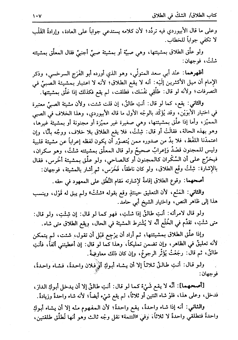 والثاني: يقع، كما لو قال: أنتِ طالقٌ، إن قلت شئت، ولأن مشيئة الصبيِّ معتبرة في اختيار الأبوَيْن، وقد يُؤَكّد بالوجْه الأول ما قاله الأبيوردي، وهذا الخلاف في الصبي المميِّز، وأما إذا علَّق بمشيئتها، وهي صغيرة غير مميِّزة أو مجنونة أو بمشيئة غيرها، وهو بهذه الحالة، فقالَتْ أو قال: شِئْتُ، فلا يقع الطلاق بلا خلاف، ووجَّه بأنَّا، وان اعتمدْنا اللفْظ، فلا بدَّ من صدوره ممن يُتصوَّر أن يكون لفظه إعراباَ عن مشيئة قلبية وليس للمجنون قصْدٌ وَإعرابٌ صحيحٌ ولو قال المعلَّق بمشيئته شئْتُ، وهو سكران، فيخرَّج على أن السَّكْران كالمجنون أو كالصاحي، ولو علَّق بمشيئة أخْرس، فقال بالإِشارة: شِئْتُ وقَع الطلاق، ولو كان ناطقاً، فَخَرَس، ثم أشار بالمشيئة، فوجهان: