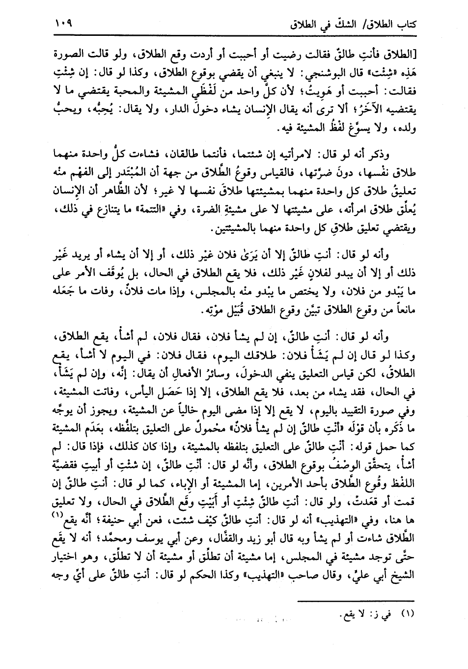 وأنه لو قال: أنتِ طالقٌ، إن لم يشأ فلان، فقال فلان، لم أشأْ، يقع الطلاق، وكذا لو قال إن لم يَشَأْ فلان: طلاقك اليوم، فقال فلان: في اليوم لا أشأ، يقع الطلاقُ، لكن قياس التعليق ينفي الدخولَ، وسائرُ الأفعالِ أن يقال: إنَّه، وإن لم يَشَأْ، في الحال، فقد يشاء من بعد، فلا يقع الطلاق، إلا إذا حَصَل اليأس، وفاتت المشيئة، وفي صورة التقييد باليوم، لا يقع إلا إذا مضى اليوم خالياً عن المشيئة، ويجوز أن يوجَّه ما ذَكَره بان قوْلَه "أنْتِ طالقٌ إن لم يشأْ فلانٌ" محْمولٌ على التعليق بتلفُّظه، بعَدَم المشيئة كما حمل قوله: أنْتِ طالقٌ على التعليق بتلفظه بالمشيئة، وإذا كان كذلك، فإذا قال: لم أشأْ, يتحقَّق الوصْفُ بوقوع الطلاق، وأنَّه لو قال: أنْتِ طالقٌ، إن شئْتِ أو أبيتِ فقضيَّة اللفْظ وقُوع الطَّلاق بأحد الأمرين، إما المشيئة أو الإِباء، كما لو قال: أنتِ طالقٌ إن قمت أو قعَدتِّ، ولو قال: أنتِ طالقٌ شِئْتِ أو أَبَيْتِ وقَع الطَّلاق في الحال، ولا تعليق هاهنا، وفي "التهذيب" أنَّه لو قال: أنتِ طالقٌ كيْف شئت، فعن أبي حنيفة؛ أنَّه يقع (¬1) الطَّلاق شاءت أو لم يشأ وبه قال أبو زيد والقفَّال، وعن أبي يوسف ومحمَّد؛ أنَّه لا يقَع حتَّى توجد مشيئة في المجلس، إما مشيئة أن تطلَّق أو مشيئة أن لا تطلَّق، وهو اختيار الشيخ أبي عليٍّ، وقال صاحب "التهذيب" وكذا الحكم لو قال: أنتِ طالقٌ على أىِّ وجه