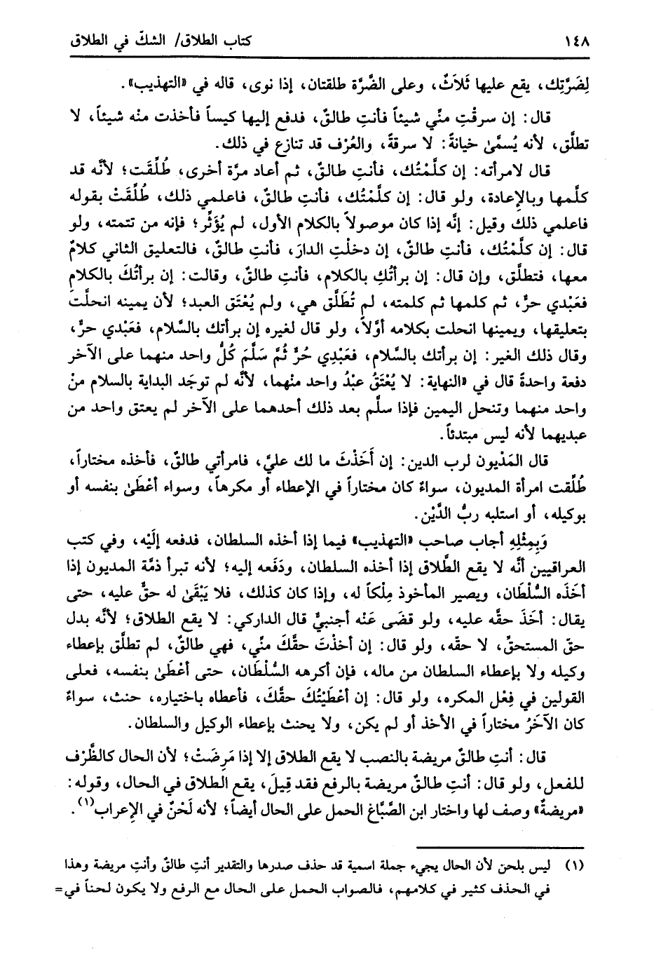 (¬1) ليس بلحن لأن الحال يجيء جملة اسمية قد حذف صدرها والتقدير أنتِ طالقٌ وأنتِ مريضة وهذا في الحذف كثير في كلامهم، فالصواب الحمل على الحال مع الرفع ولا يكون لحنًا في =