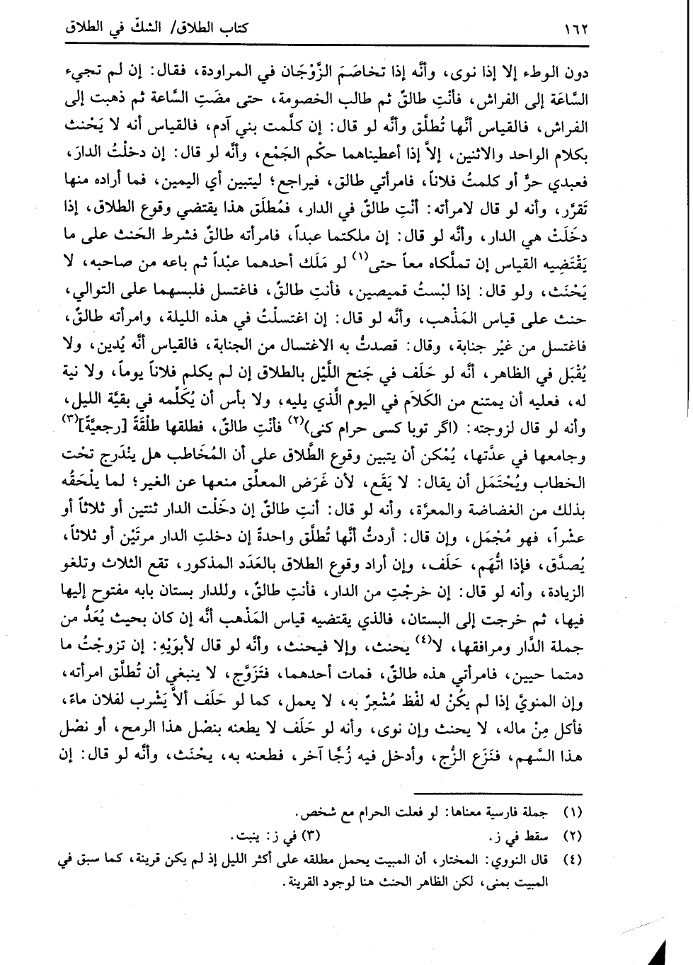دون الوطء إلا إذا نوى، وأنَّه إذا تخاصَمَ الزَّوْجَان في المراودة، فقال: إن لم تجيء السَّاعَة إلى الفراش، فأنْتِ طالقٌ ثم طالب الخصومة، حتى مضَتِ السَّاعة ثم ذهبت إلى الفراش، فالقياس أنَّها تُطلَّق وأنَّه لو قال: إن كلَّمت بني آدم، فالقياس أنه لا يَحْنث بكلام الواحد والاثنين، إلاَّ إذا أعطيناهما حكْم الجَمْع، وأنَّه لو قال: إن دخلْتُ الدارَ، فعبدي حرٌّ أو كلمتُ فلانًا، فامرأتي طالق، فيراجع؛ ليتبين أي اليمين، فما أراده منها تَقرَّر، وأنه لو قال لامرأته: أنْتِ طالق في الدار، فمُطلَق هذا يقتضي وقوع الطلاق، إذا دخَلَتْ هي الدار، وأنَّه لو قال: إن ملكتما عبداً، فامرأته طالقٌ فشرط الحَنث على ما يَقْتَضِيه القياس إن تملَّكاه معاً حتى (¬1) لو مَلَك أحدهما عبْداً ثم باعه من صاحبه، لا يَحْنَث، ولو قال: إذا لبْستُ قميصين، فأنتِ طالقٌ، فاغتسل فلبسهما على التوالي، حنث على قياس المَذْهب، وأنَّه لو قال: إن اغتسلْتُ في هذه الليلة، وامرأته طالقٌ، فاغتسل من غيْر جنابة، وقال: قصدتُّ به الاغتسال من الجنابة، فالقياس أنَّه يُدين، ولا يُقْبَل في الظاهر، أنَّه لو حَلَف في جَنح اللَّيْل بالطلاق إن لم يكلم فلانًا يوماً، ولا نية له، فعليه أن يمتنع من الكَلاَم في اليوم الَّذي يليه؛ ولا بأس أن يُكَلِّمه في بقيَّة الليل، وأنه لو قال لزوجته: (اكَر توبا كسى حرام كنى) (¬2) فأنْتِ طالقٌ، فطلقها طلْقَةً [رجعيَّةً] (¬3) وجامعها في عدَّتها، يُمْكن أن يتبين وقوع الطَّلاق على أن المُخَاطب هل ينْدَرج تحت الخطاب ويُحْتَمَل أن يقال؛ لا يَقَع؛ لأن غَرَض المعلِّق منعها عن الغير؛ لما يلْحَقُه بذلك من الغضاضة والمعرَّة، وأنه لو قال: أنتِ طالقٌ إن دخَلْت الدار ثنتين أو ثلاثاً أو عشْرًا، فهو مُجْمَل، وإن قال: أردتُّ أنَّها تُطلَّق واحدةً إن دخلتِ الدار مرتَيْن أو ثلاثاً، يُصدَّق، فإذا اتُّهَم، حَلَف، وإن أراد وقوع الطلاق بالعَدَد المذكور، تقع الثلاث وتلغو الزيادة، وأنه لو قال: إن خرجْتِ من الدار، فأنتِ طالقٌ، وللدار بستان بابه مفتوح إليها فيها، ثم خرجت إلى البستان، فالذي يقتضيه قياس المَذْهب أنَّه إن كان بحيث يُعَدُّ من جملة الدَّار ومرافقها, لا (¬4) يحنث، وإلا فيحنث، وأنَّه لو قال لأبوَيْهِ: إن تزوجْتُ ما دمتما حيين، فامرأتي هذه طالقٌ، فمات أحدهما، فتَزَوَّج، لا ينبغي أن تُطلَّق امرأته، وإن المنويَّ إذا لم يكُنْ له لفْظ مُشْعِرٌ به، لا يعمل، كما لو حَلَف ألاَّ يَشْرب لفلان ماءً، فأكل مِنْ ماله، لا يحنث وإن نوى، وأنه لو حَلَف لا يطعنه بنصل هذا الرمح، أو نصْل هذا السَّهم، فنَزَع الزُّج، وأدخل فيه زُجًّا آخر، فطعنه به، يحْنَث، وأنَّه لو قال: إن