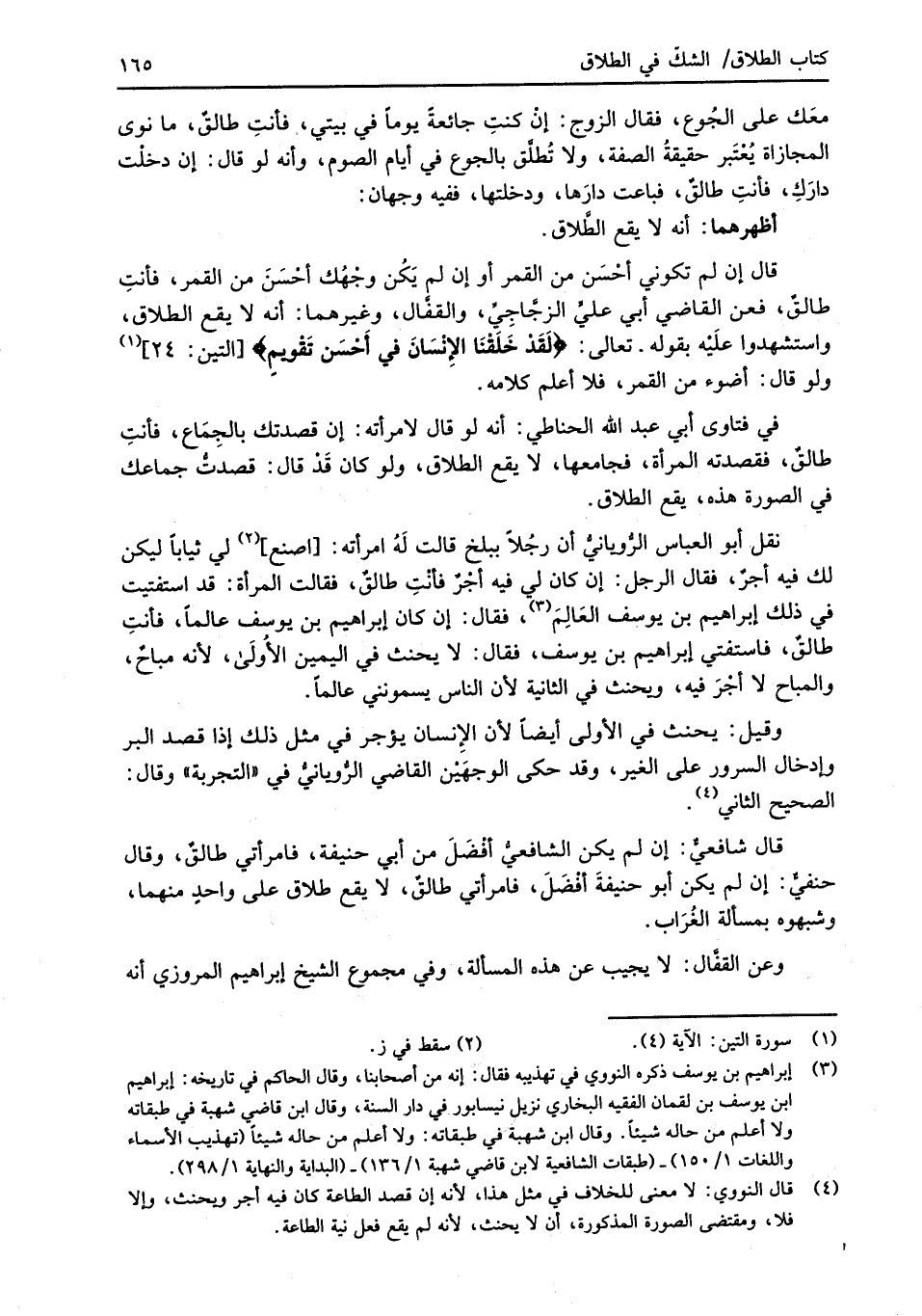 نقل أبو العباس الرُّويانيُّ أن رجلا ببلخ قالت لَهُ امرأته: [اصنع] (¬2) لي ثيابًا ليكن لك فيه أجرٌ، فقال الرجل: إن كان لي فيه أجْرٌ فأنْتِ طالقٌ، فقالت المرأة: قد استفتيت في ذلك إبراهيم بن يوسف العَالِمَ (¬3)، فقال: إن كان إبراهيم بن يوسف عالماً، فأنتِ طالقٌ، فاستفتي إبراهيم بن يوسف، فقال: لا يحنث في اليمين الأُولَى, لأنه مباحٌ، والمباح لا أجْرَ فيه، ويحنث في الثانية لأن الناس يسمونني عالماً.