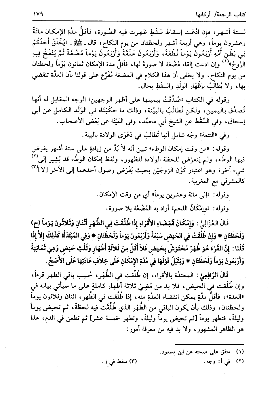 لستة أشهر، فإِن ادَّعَت إسقاطَ سَقْطٍ ظهرت فيه الصُّورة، فأقلُّ مدَّةِ الإمكان مائَةٌ وعشرون يوماً، وهي أربعة أشهر ولحظتان من يوم النكاح، قال -صلى الله عليه وسلم- "يُخْلَقُ أَحَدُكُمْ في بَطْن أُمِّهِ أَرْبَعُونَ يَوْمًا نُطْفَةً، وَأَرْبَعُونَ عَلَقَةً وَأَربَعُونَ يَوْمًا مُضْغَةً ثُمَّ يُنْفَخُ فِيهِ الرُّوحُ" (¬1) وإن ادعت إلقاء مُضْغة لا صورةَ لها، فأقلُّ مدة الإمكان ثمانون يَوْمًا ولحظتان من يوم النكاح، ولا يخفى أن هذا الكلام في المضغة مُفَرَّع على قولنا بأن العدَّة تنقضي بها, ولا يُطالَبُ بإظْهَار الولَدِ والسقْطِ بحال.