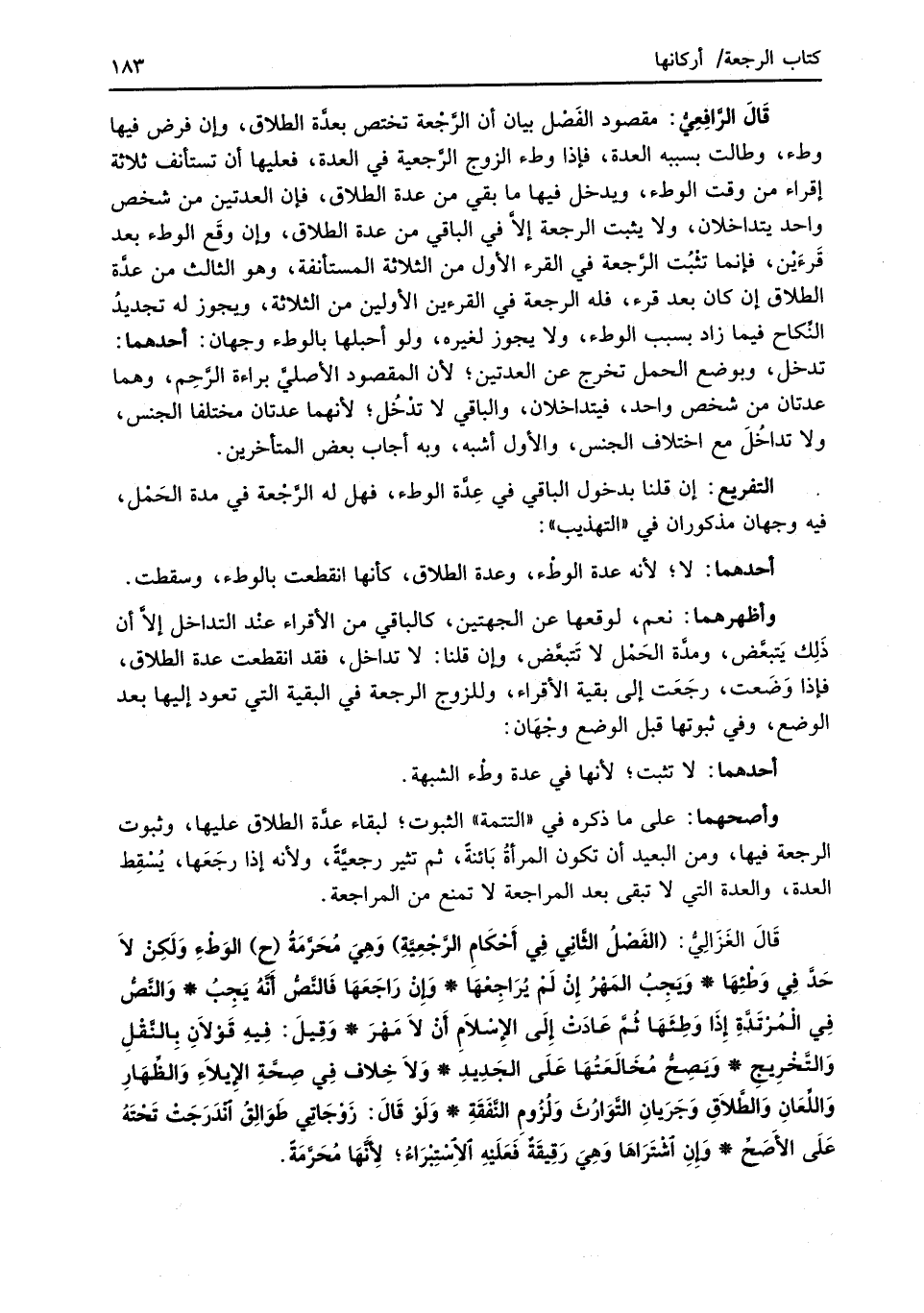 قَالَ الرَّافِعِيُّ: مقصود الفَصْل بيان أن الرَّجْعة تختص بعدَّة الطلاق، وإن فرض فيها وطء، وطالت بسببه العدة، فإذا وطء الزوج الرَّجعية في العدة، فعليها أن تستأنف ثلاثة إقراء من وقت الوطء، ويدخل فيها ما بقي من عدة الطلاق، فإن العدتين من شخص واحد يتداخلان، ولا يثبت الرجعة إلاَّ في الباقي من عدة الطلاق، وإن وقَع الوطء بعد قَرءَيْن، فإنما تثْبُت الرَّجعة في القرء الأول من الثلاثة المستأنفة، وهو الثالث من عدَّة الطلاق إن كان بعد قرء، فله الرجعة في القرءين الأولين من الثلاثة، ويجوز له تجديدُ النِّكاح فيما زاد بسبب الوطء، ولا يجوز لغيره، ولو أحبلها بالوطء وجهان: أحدهما: تدخل، وبوضع الحمل تخرج عن العدتين؛ لأن المقصود الأصليَّ براءة الرَّحِم، وهما عدتان من شخص واحد، فيتداخلان، والباقي لا تدْخُل؛ لأنهما عدتان مختلفا الجنس، ولا تداخُلَ مع اختلاف الجنس، والأول أشبه، وبه أجاب بعض المتأخرين.