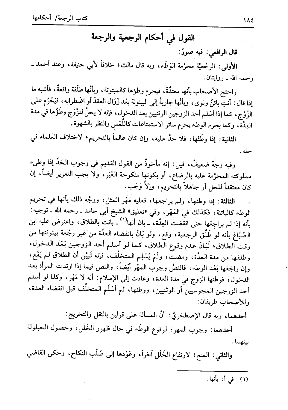 الأولى: الرجْعيَّة محرَّمة الوَطْء، وبه قال مالك؛ خلافاً لأبي حنيفة، وعند أحمد -رحمه الله- روايتان.