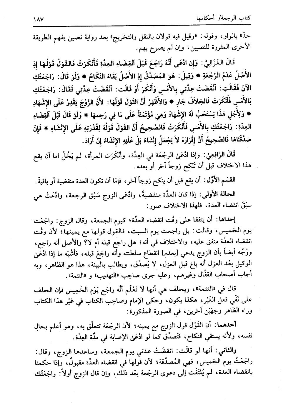 قَالَ الغَزَالِيُّ: وَإِنْ ادَّعَى أنَّهُ رَاجَعَ قَبْلَ انْقِضَاءِ العِدَّةِ فَأنْكرَتْ فَالقَوْلُ قَوْلُهَا إِذِ الأَصْلُ عَدَمُ الرَّجْعَةِ* وَقِيلَ: هُوَ المُصَدَّقُ إِذِ الأَصْلُ بَقَاءُ النِّكَاحُ* وَلَوْ قَالَ: رَاجَعْتُكِ الآنَ فَقَالَتِ: انْقَضَتْ عِدَّتِي بِالأَمْسِ وَأَنْكَرَ أَوْ قَالَت: انْقَضَتْ عِدَّتِي فَقَالَ: رَاجَعْتُكِ بَالأَمْسِ فَأنْكَرَت فَالخِلاَفُ جَارِ* وَالأَظْهَرُ أَنَّ القَوْلَ قَوْلُهَا: لأَنَّ الزَّوْجَ يَقْدِرُ عَلَى الإِشْهَادِ *وَلأَجْلِ هَذَا يُسْتَحَبُّ لَهُ الإِشْهَادُ وَهِيَ مُؤْتَمَنَةٌ عَلَى مَا فِي رَحِمهَا* وَلَوْ قَالَ قَبْلَ انْقِضَاءِ العِدّةِ: رَاجَعْتُكِ بِالأَمْسِ فَأنْكَرَت فَالصَّحِيحُ أَنَّ القَوْلَ قَوْلُهُ لِقُدْرَتِهِ عَلَى الإِنْشَاءِ* فَإِنْ صَدَّقْنَاهَا فَالصَّحِيحُ أَنَّ إِقْرَارَهُ لاَ يُجْعَلُ إِنْشَاءً بَلْ عَلَيْهِ الإِنْشَاءُ إنْ أَرَادَ.