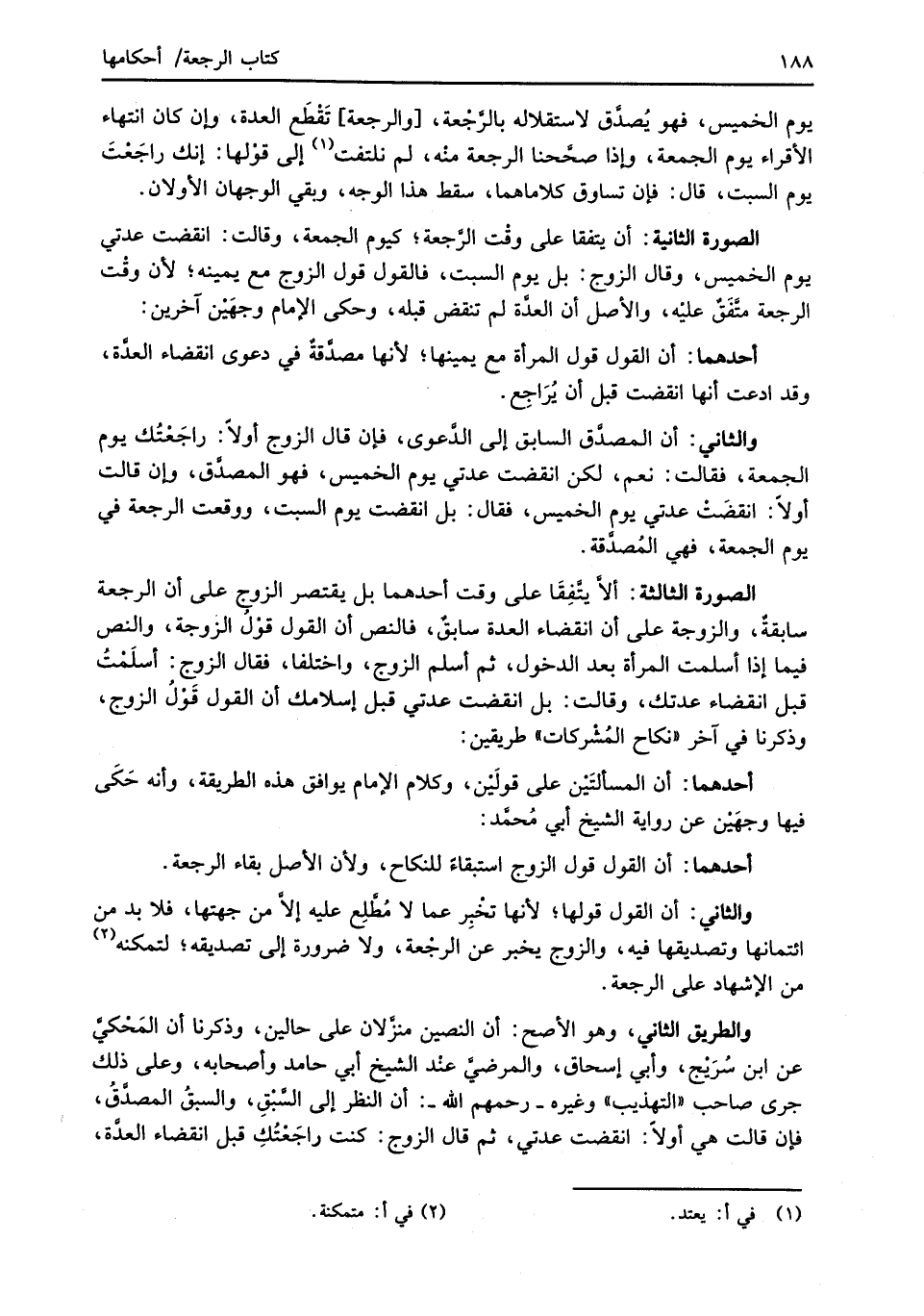 الصورة الثانية: أن يتفقا على وقْت الرَّجعة؛ كيوم الجمعة، وقالت: انقضت عدتي يوم الخميس، وقال الزوج: بل يوم السبت، فالقول قول الزوج مع يمينه؛ لأن وقْت الرجعة متَّفَقٌ عليْه، والأصل أن العدَّة لم تنقض قبله، وحكى الإِمام وجهَيْن آخرين: