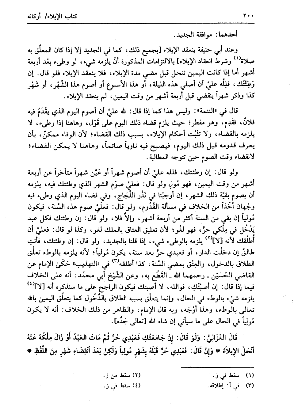 قَالَ الغَزَالِيُّ: وَلَوْ قَالَ: إِنْ جَامَعْتُكِ فَعَبْدِي حُرٌّ ثُمَّ مَاتَ العَبْدُ أَوْ زَالَ مِلْكُهُ عَنْهُ انْحَلَ الإِيلاَءُ* وَإِنْ قَالَ: فَعَبْدِي حُرٌّ قَبْلَهُ بِشَهْرٍ مُولِيًا وَلَكِنْ بَعْدَ انْقِضَاءِ شَهْرٍ مِنَ اللَّفْظِ*