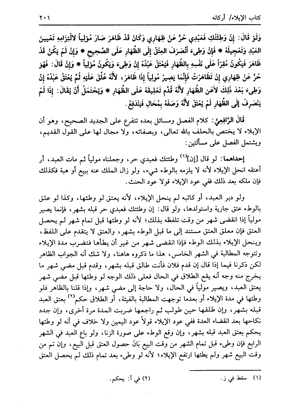 قَالَ الرَّافِعِيُّ: كلام الفصل ومسائل بعده تتفرع على الجديد الصحيح، وهو أن الإيلاء لا يختص بالحلف بالله تعالى، وبصفاته، ولا مجال لها على القول القديم، ويشتمل الفصل على مسألتين:
